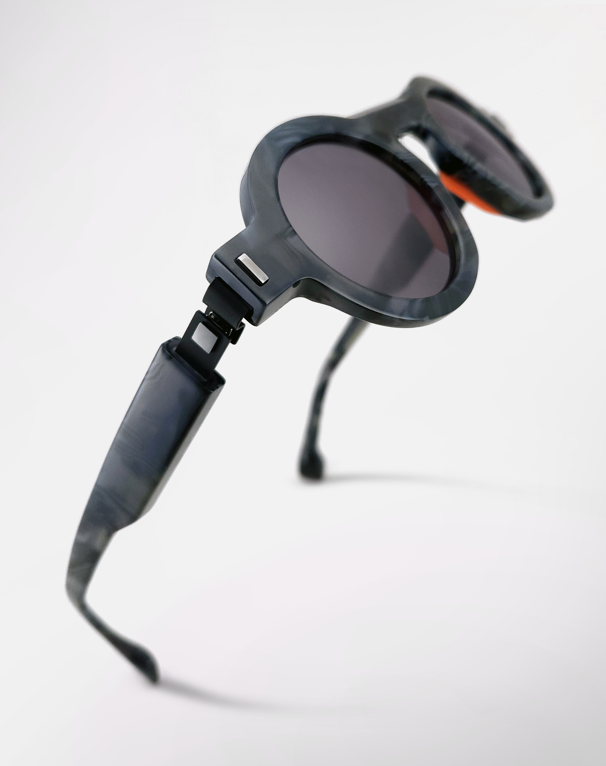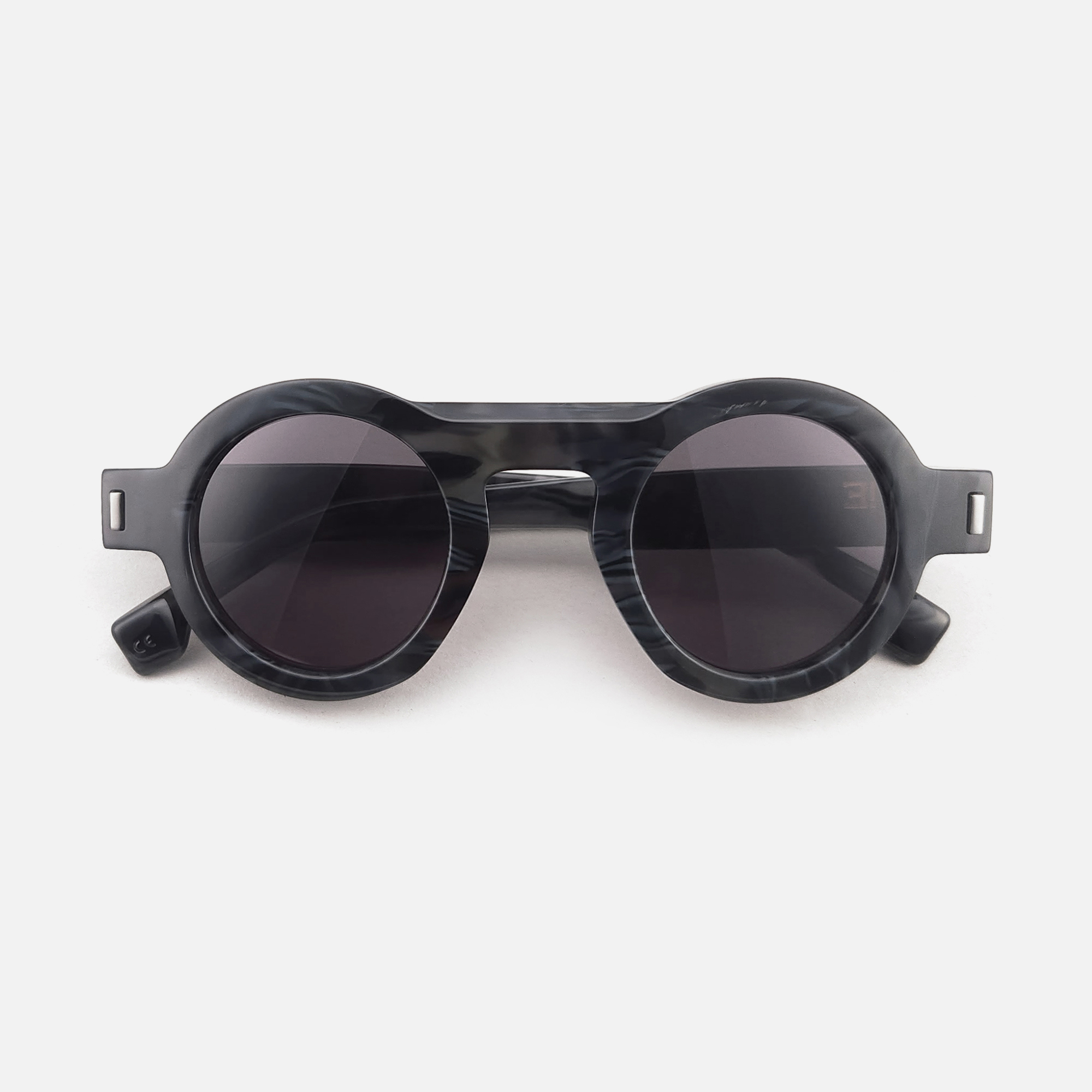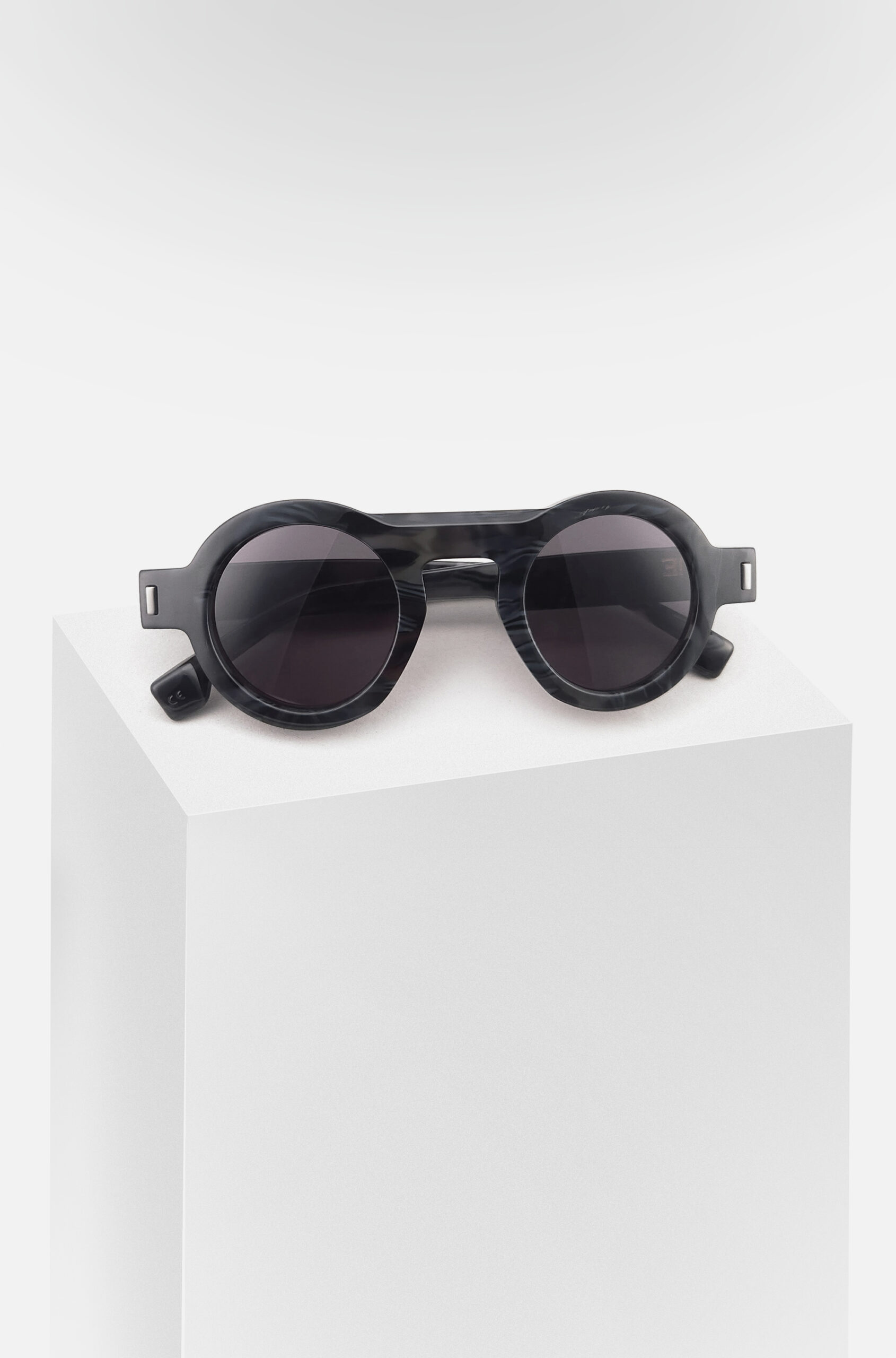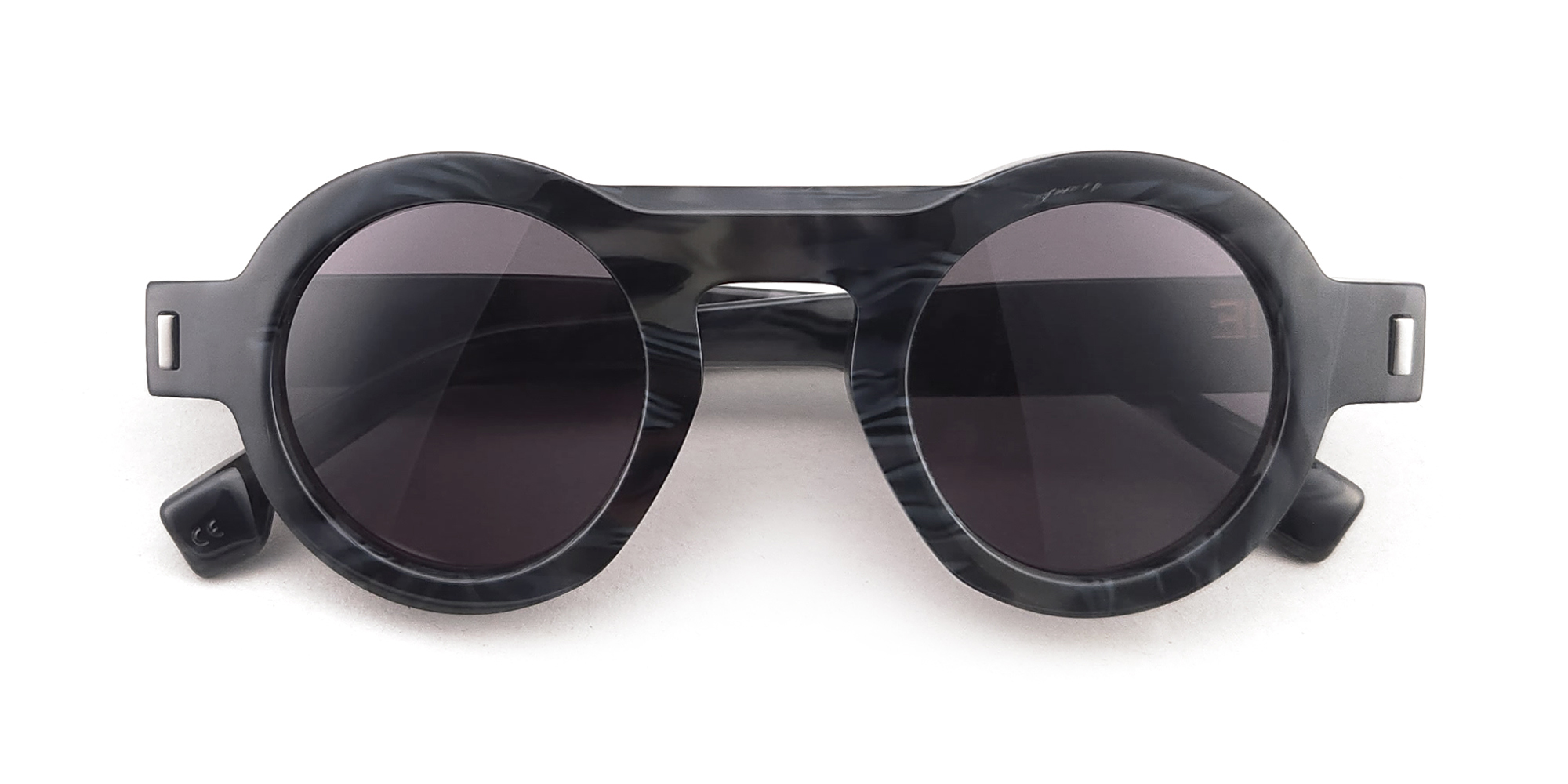 Une monture solaire de forme ronde, objet de design, réalisée en acétate revalorisé.