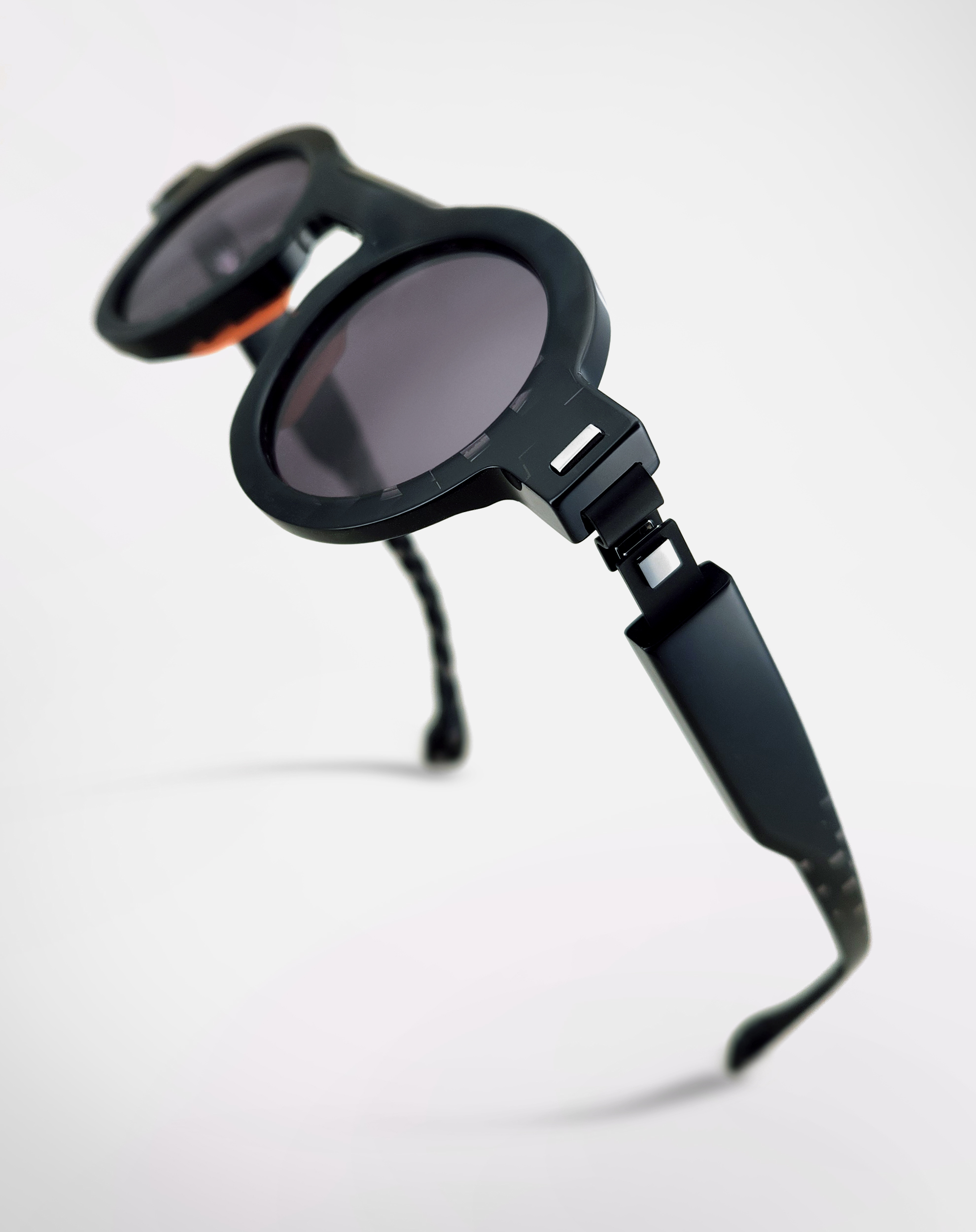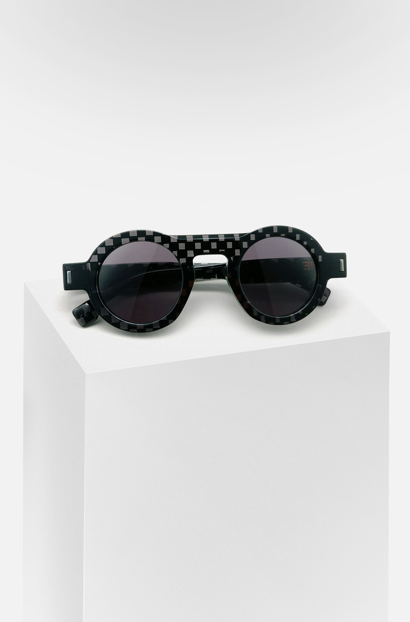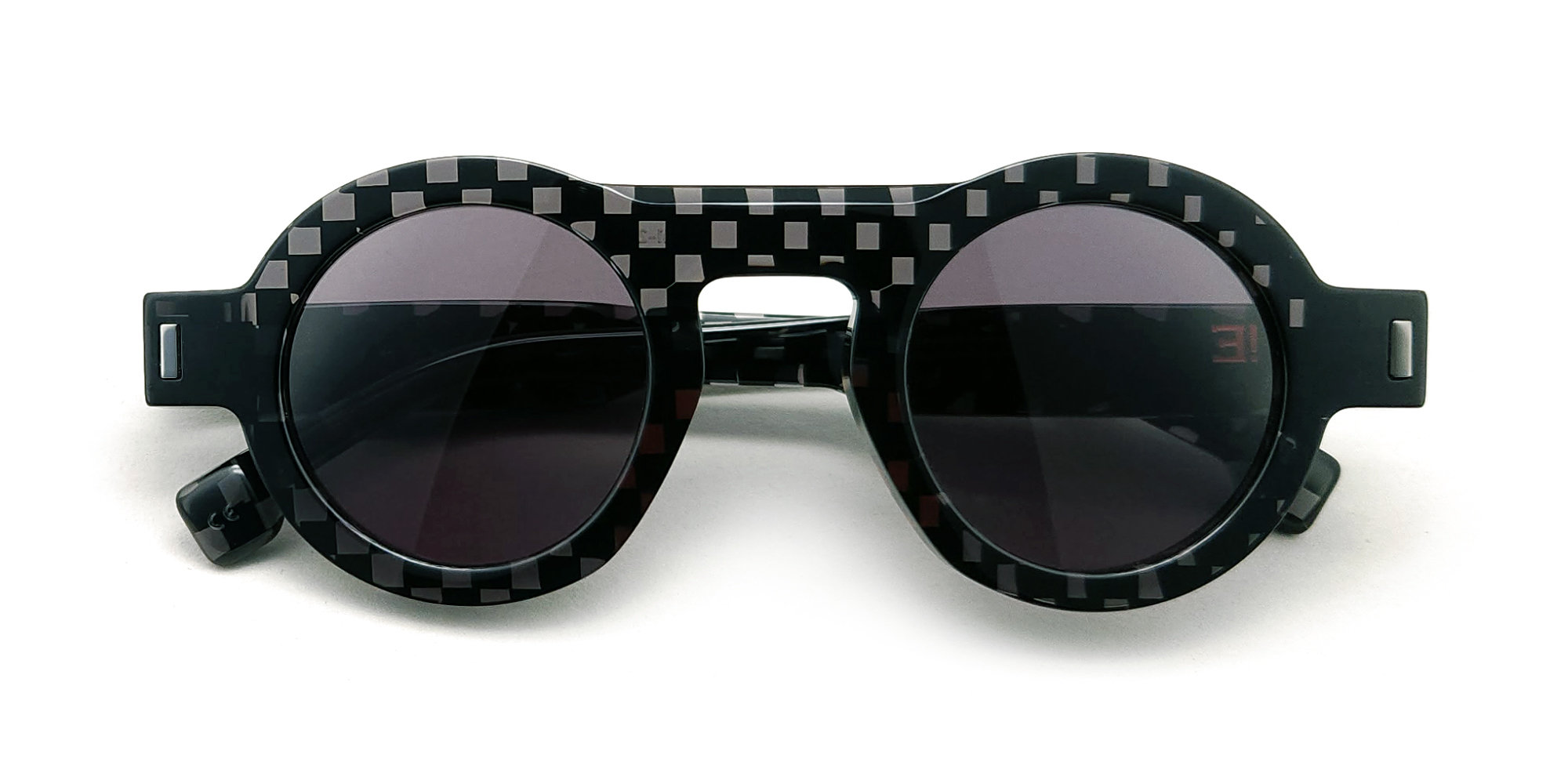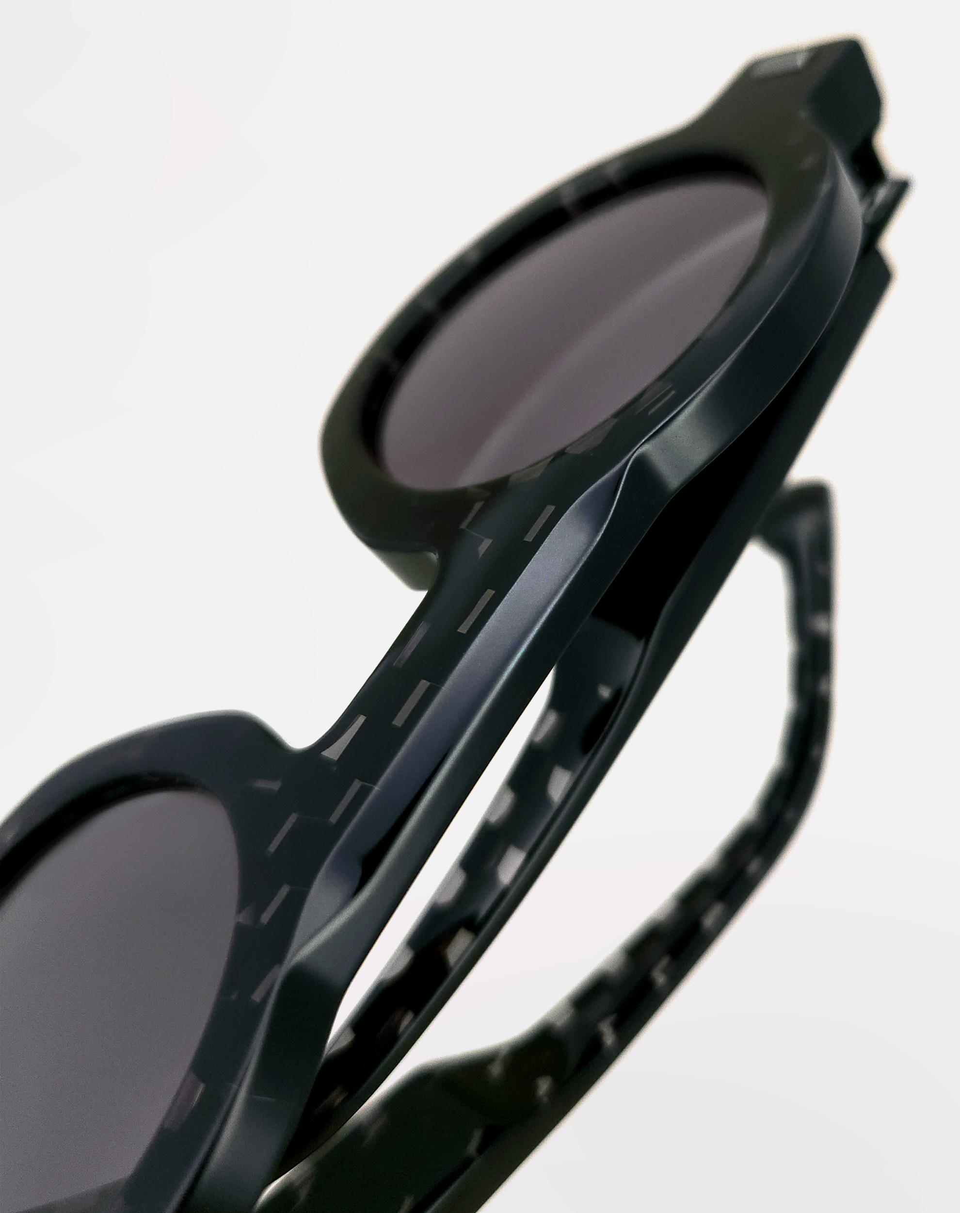Une monture solaire de forme ronde, objet de design, réalisée en acétate revalorisé.
