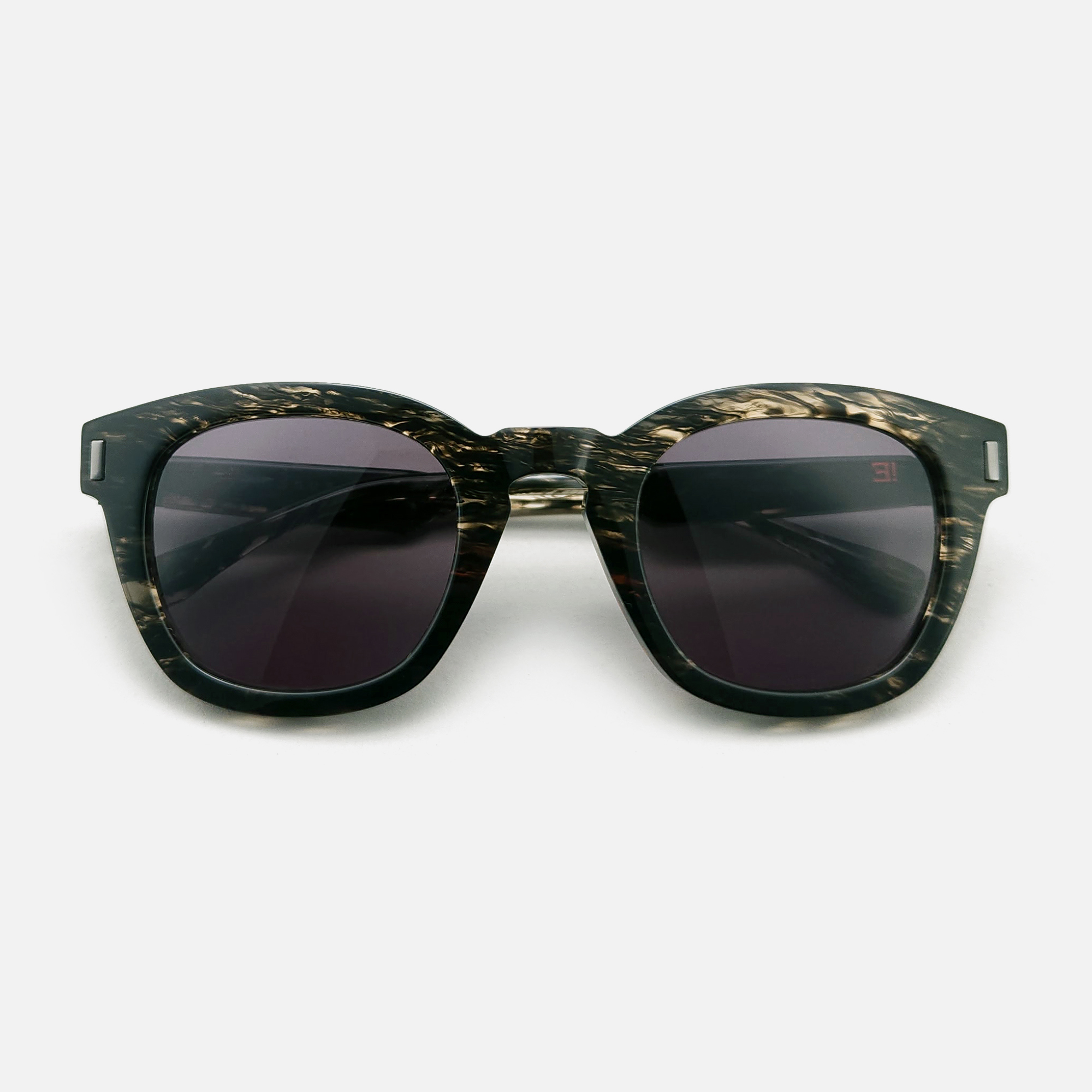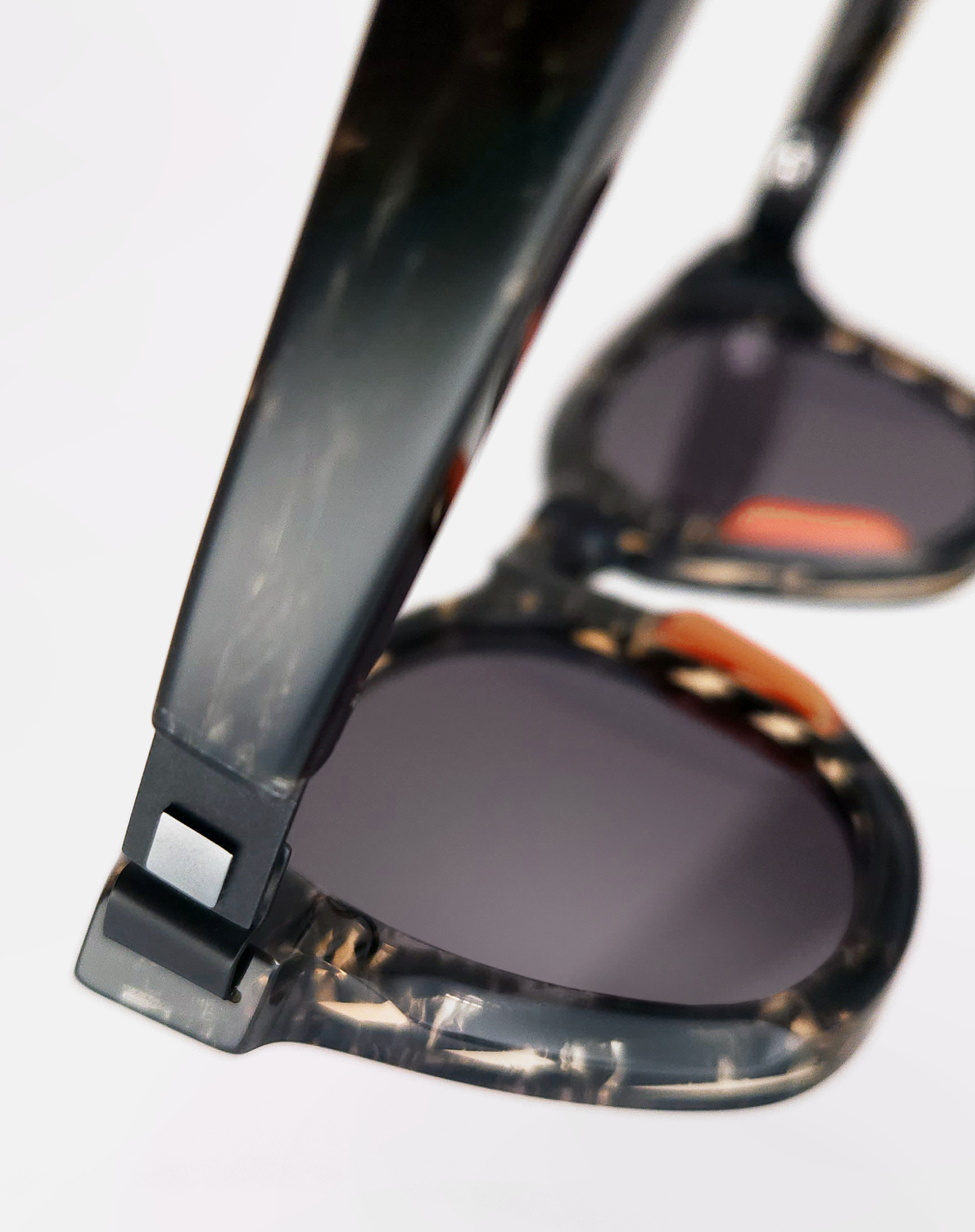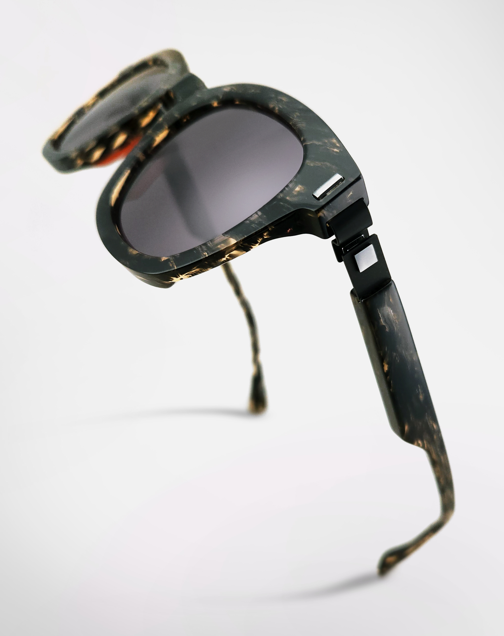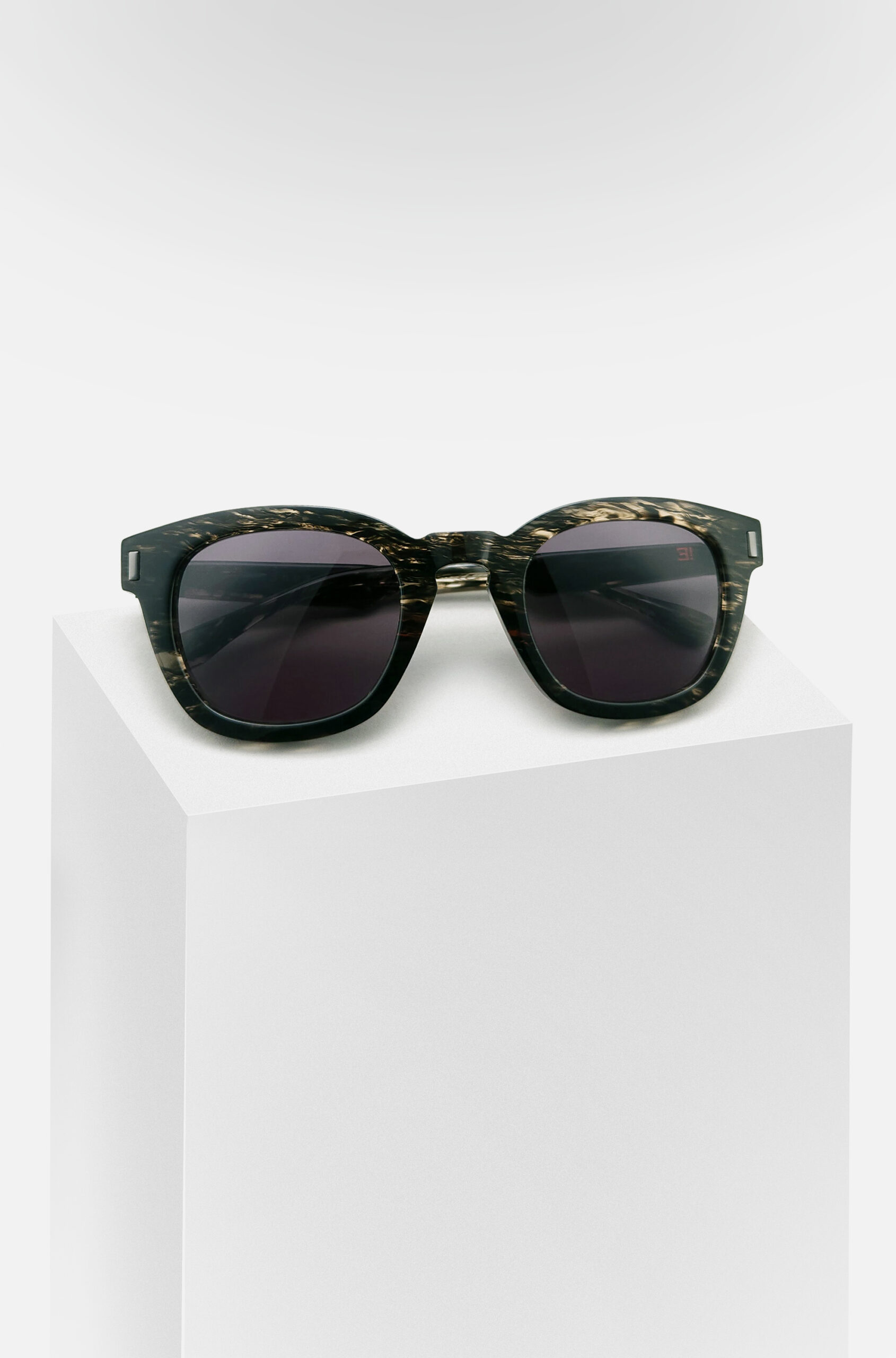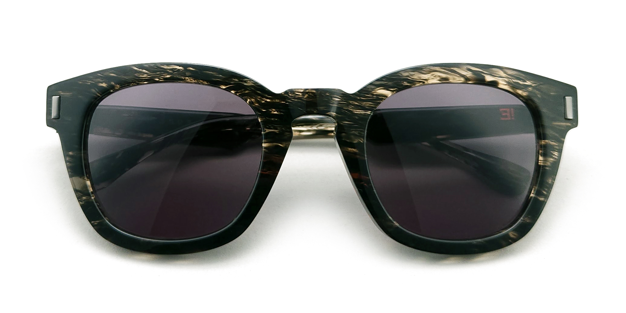 Une monture solaire de forme carrée, objet de design, réalisée en BIO-acétate revalorisé.
