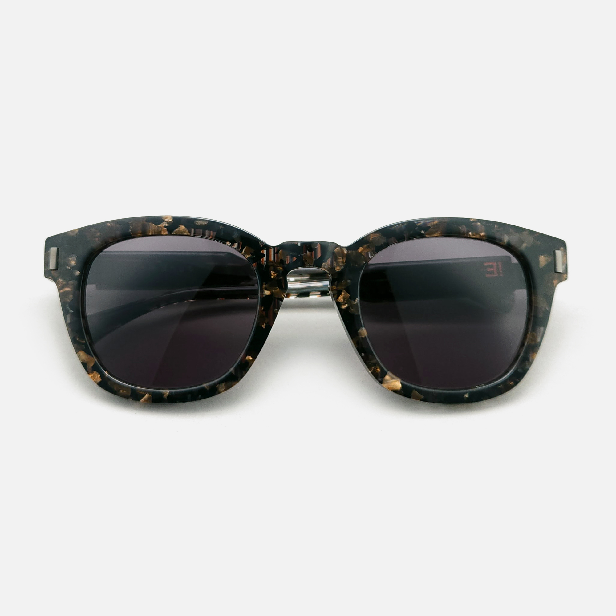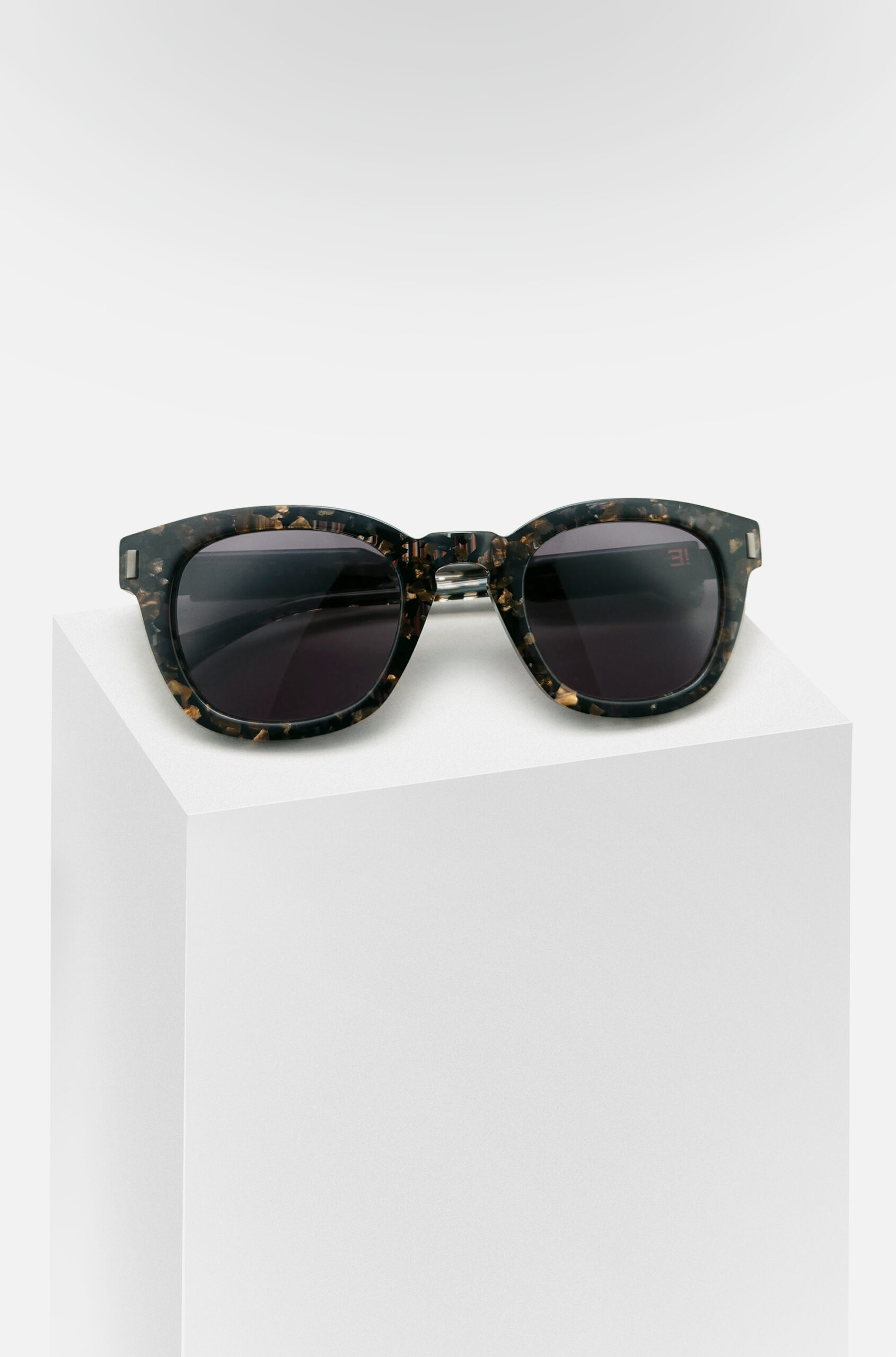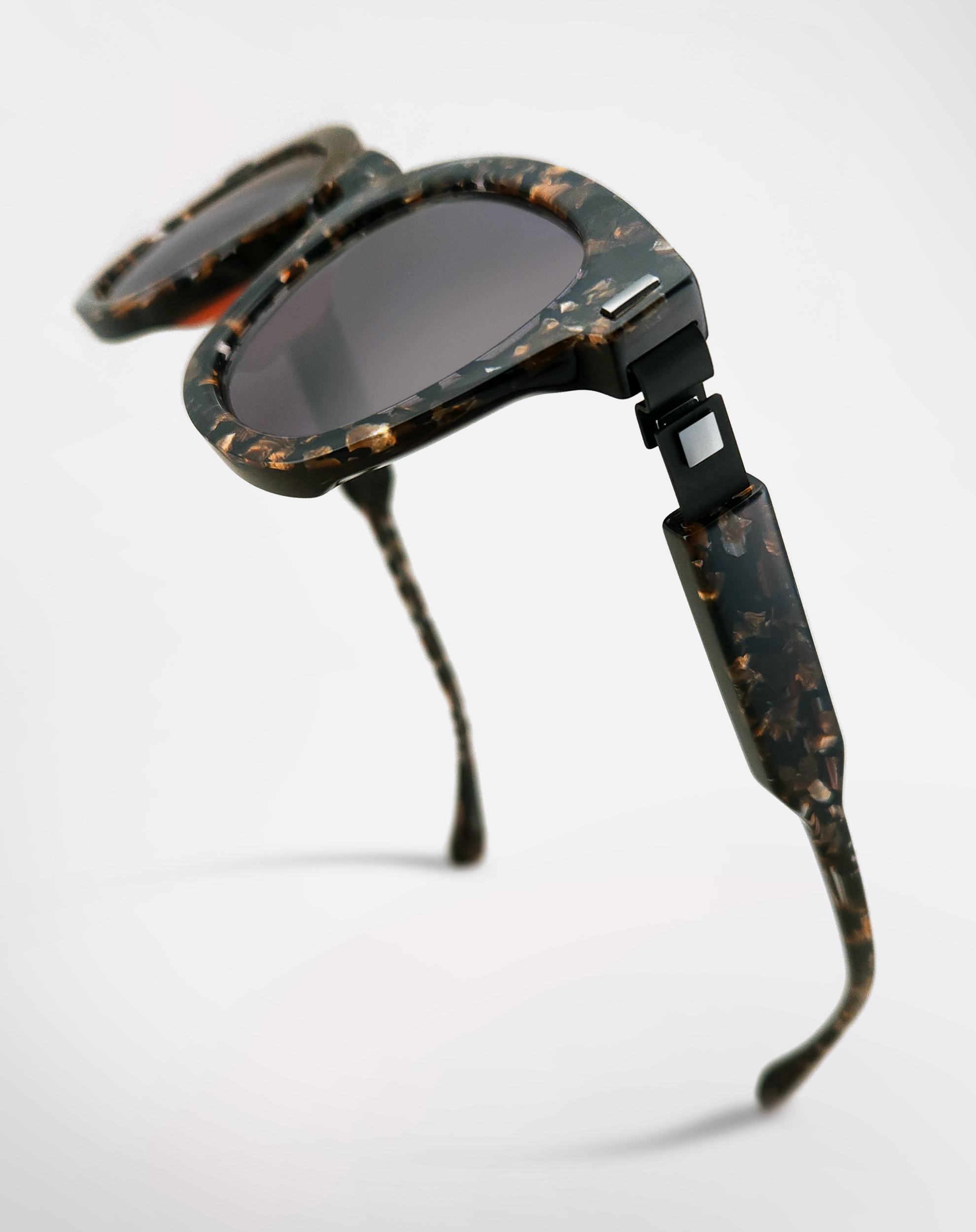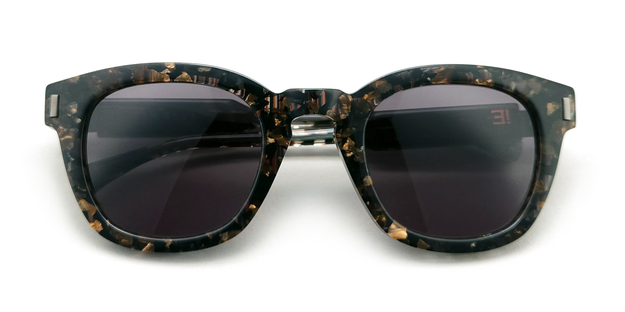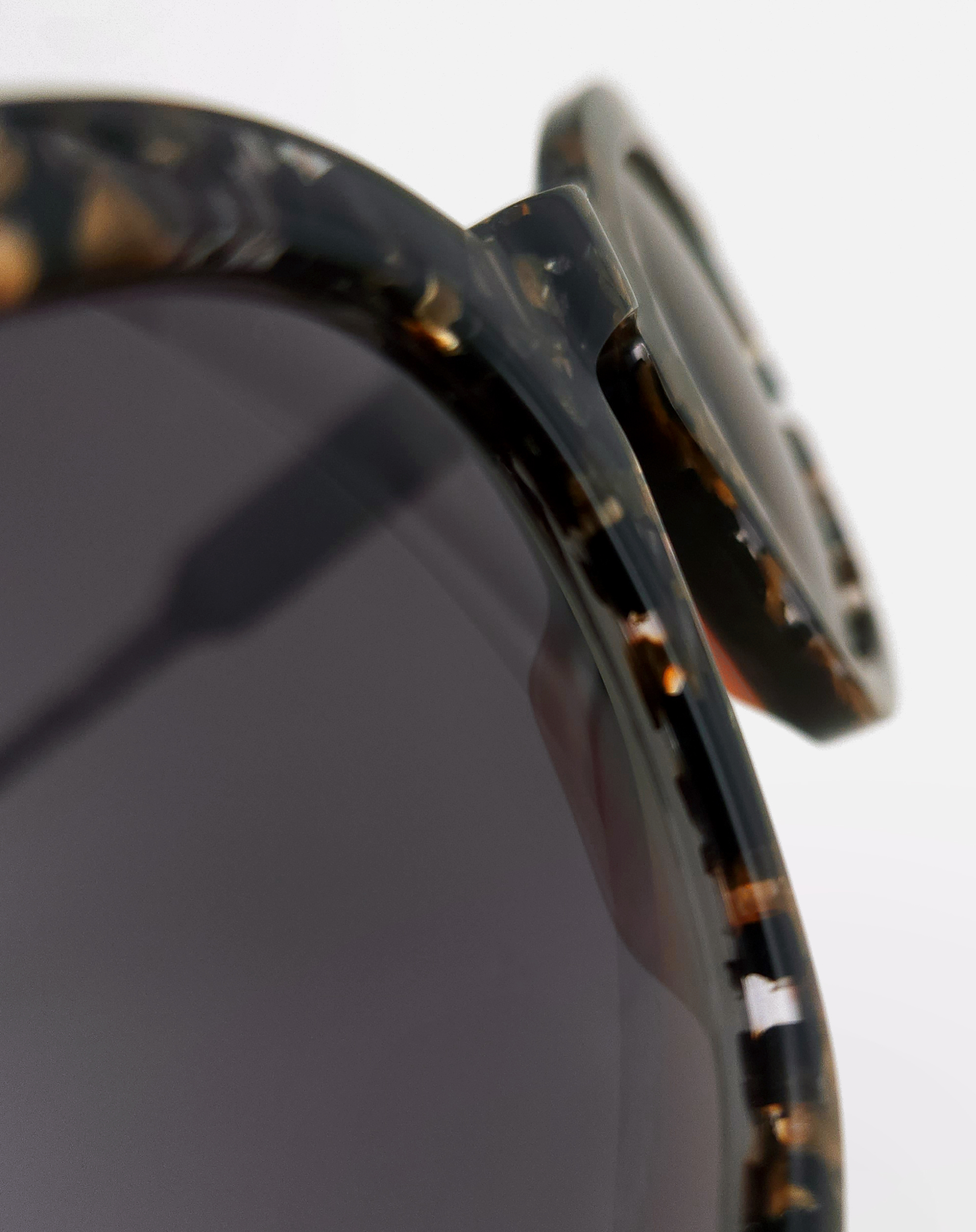 Une monture solaire de forme carrée, objet de design, réalisée en acétate revalorisé.