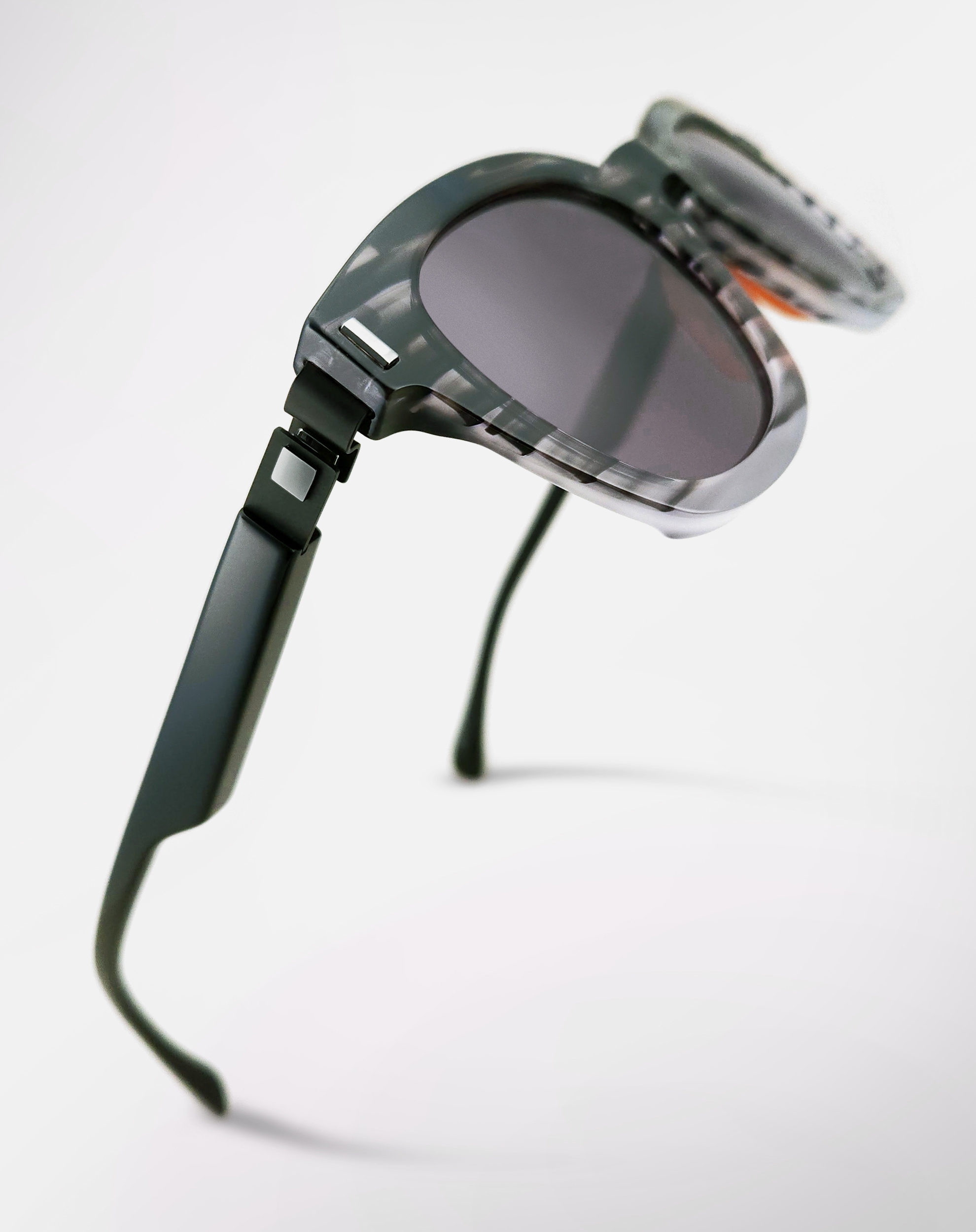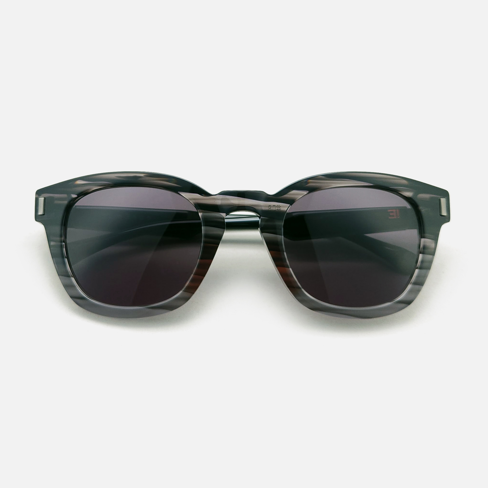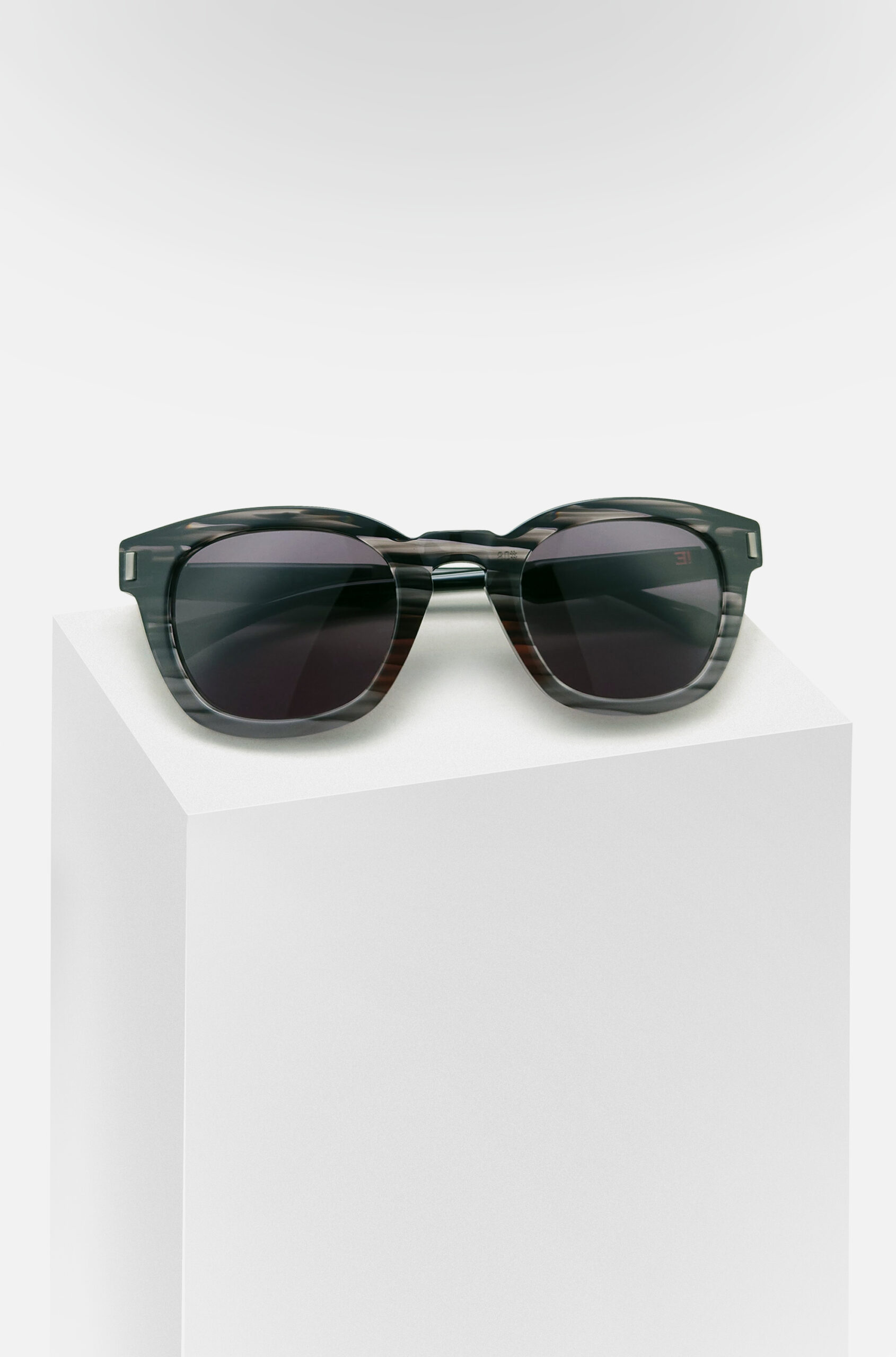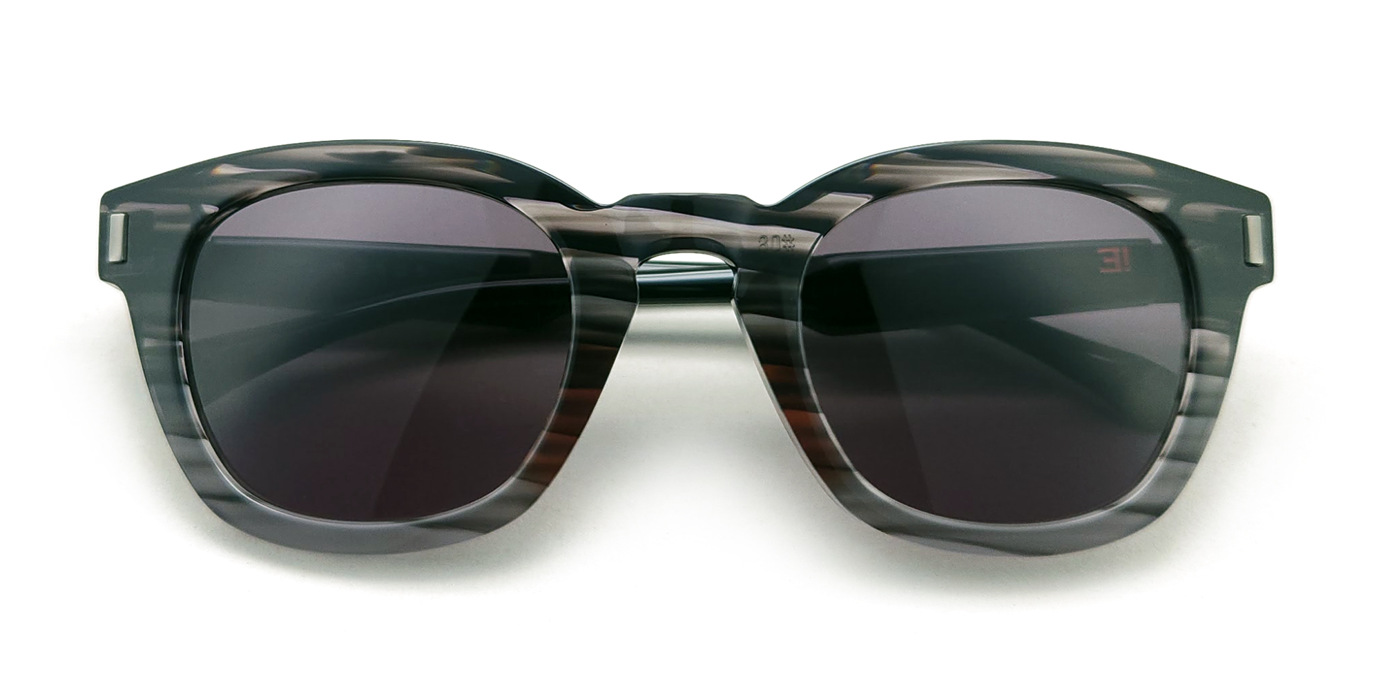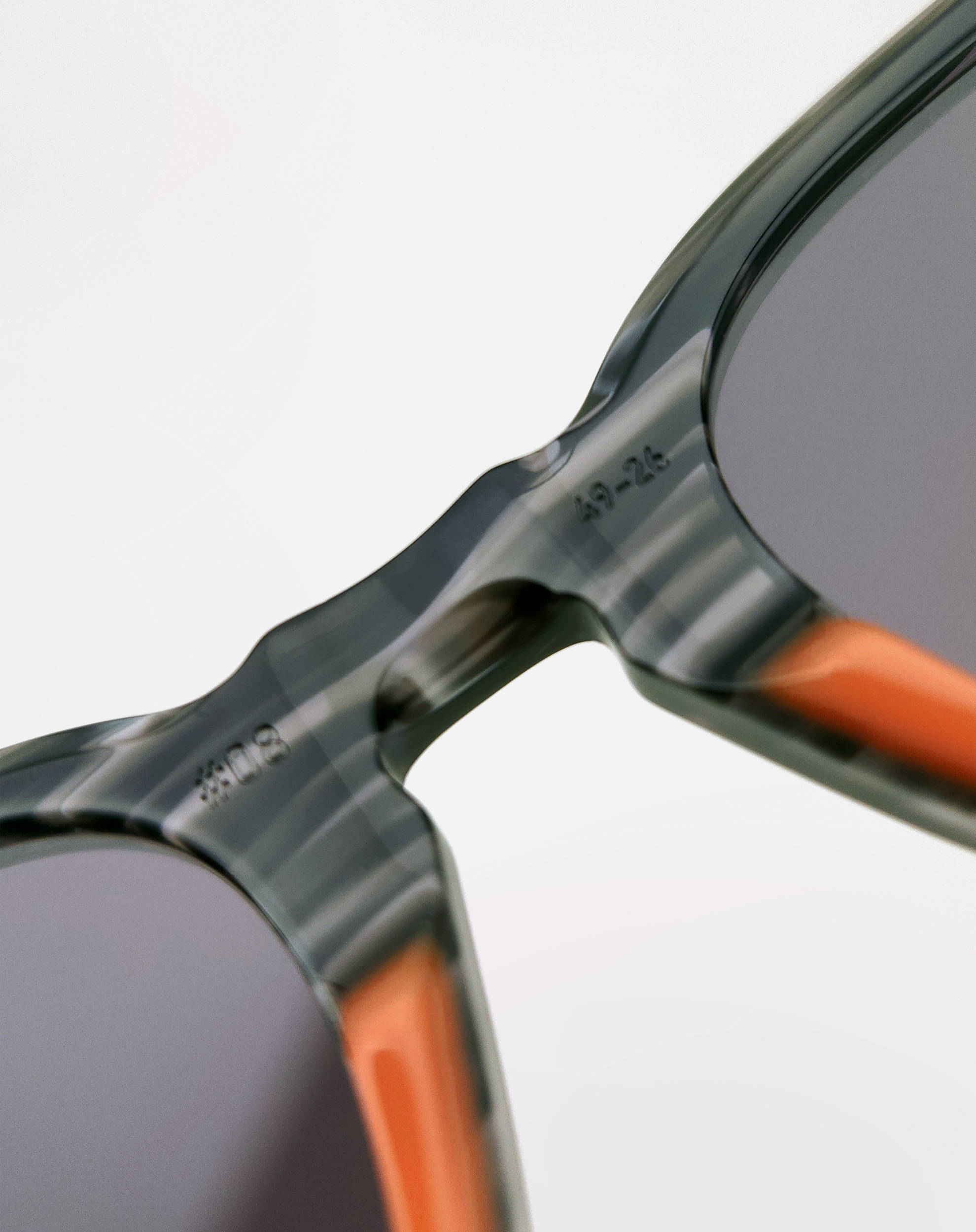 Une monture solaire de forme carrée, objet de design, réalisée en acétate revalorisé.