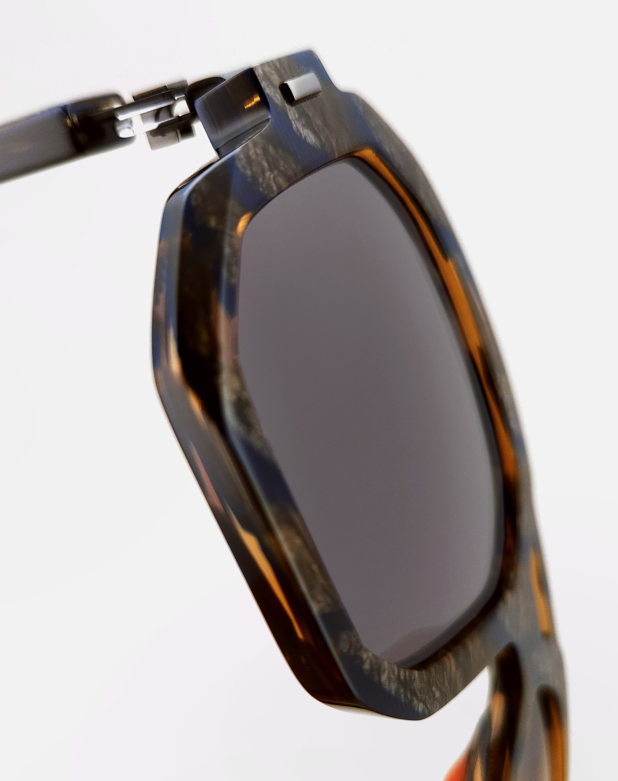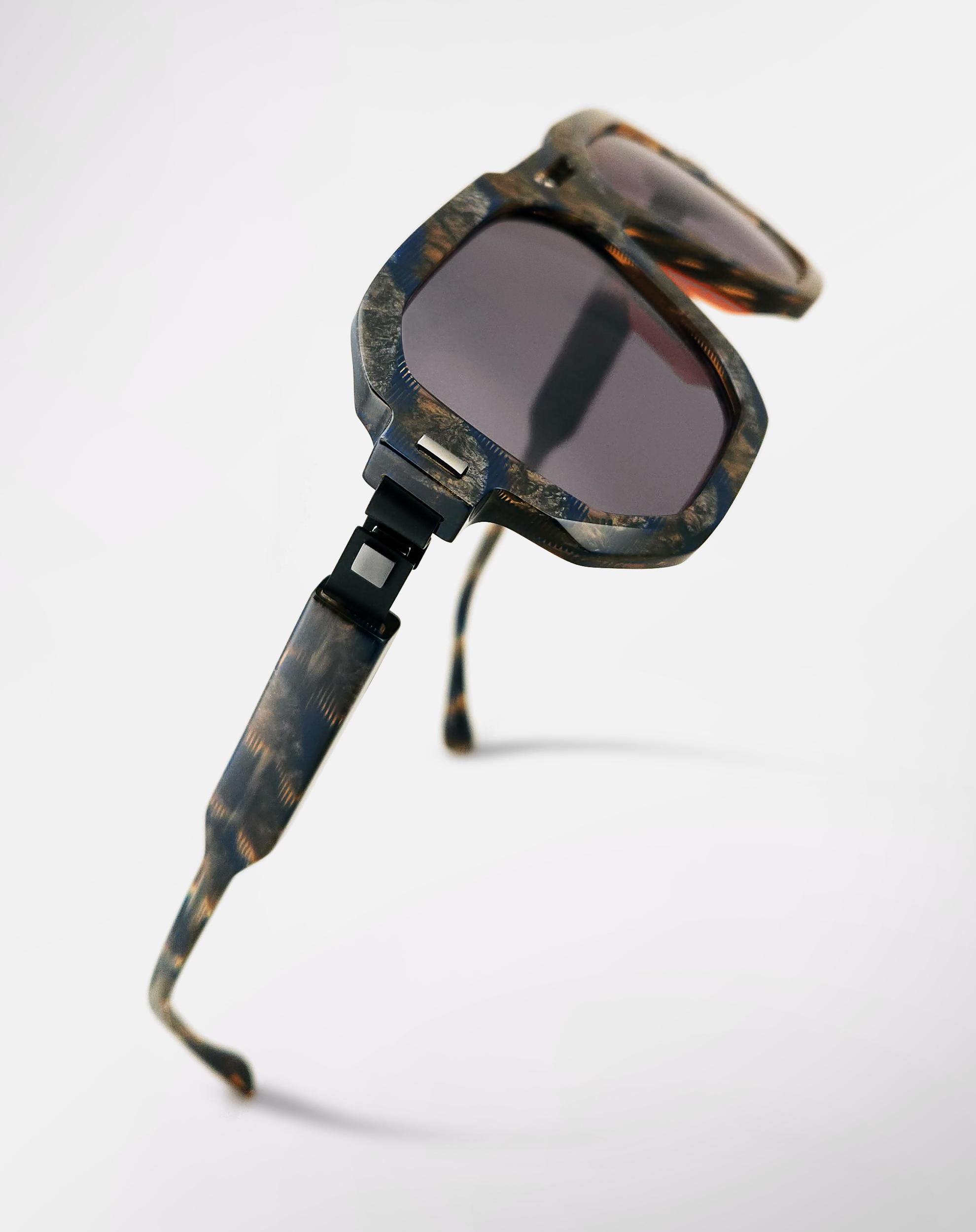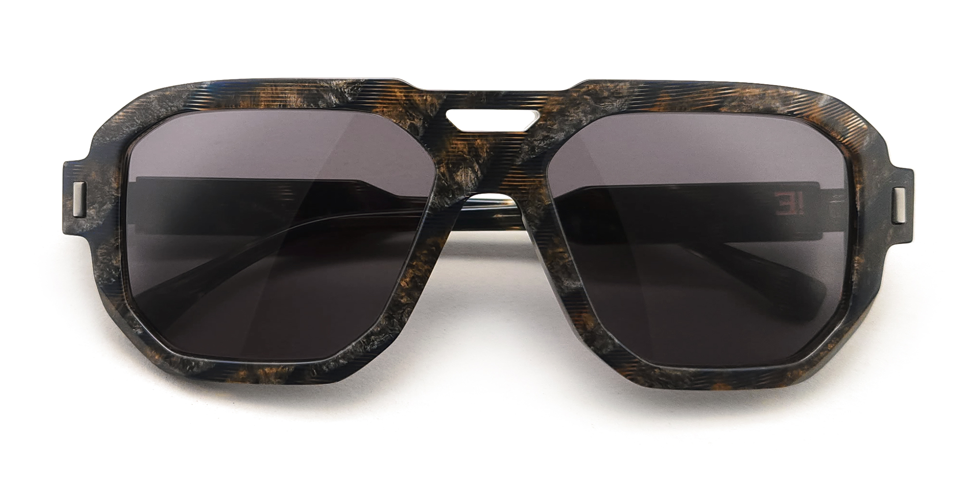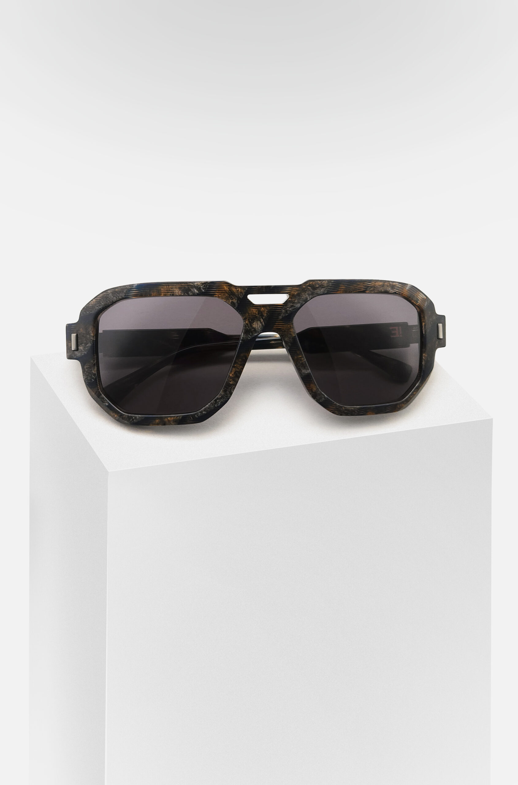 Une monture solaire de forme pilote, objet de design, réalisée en acétate revalorisé.