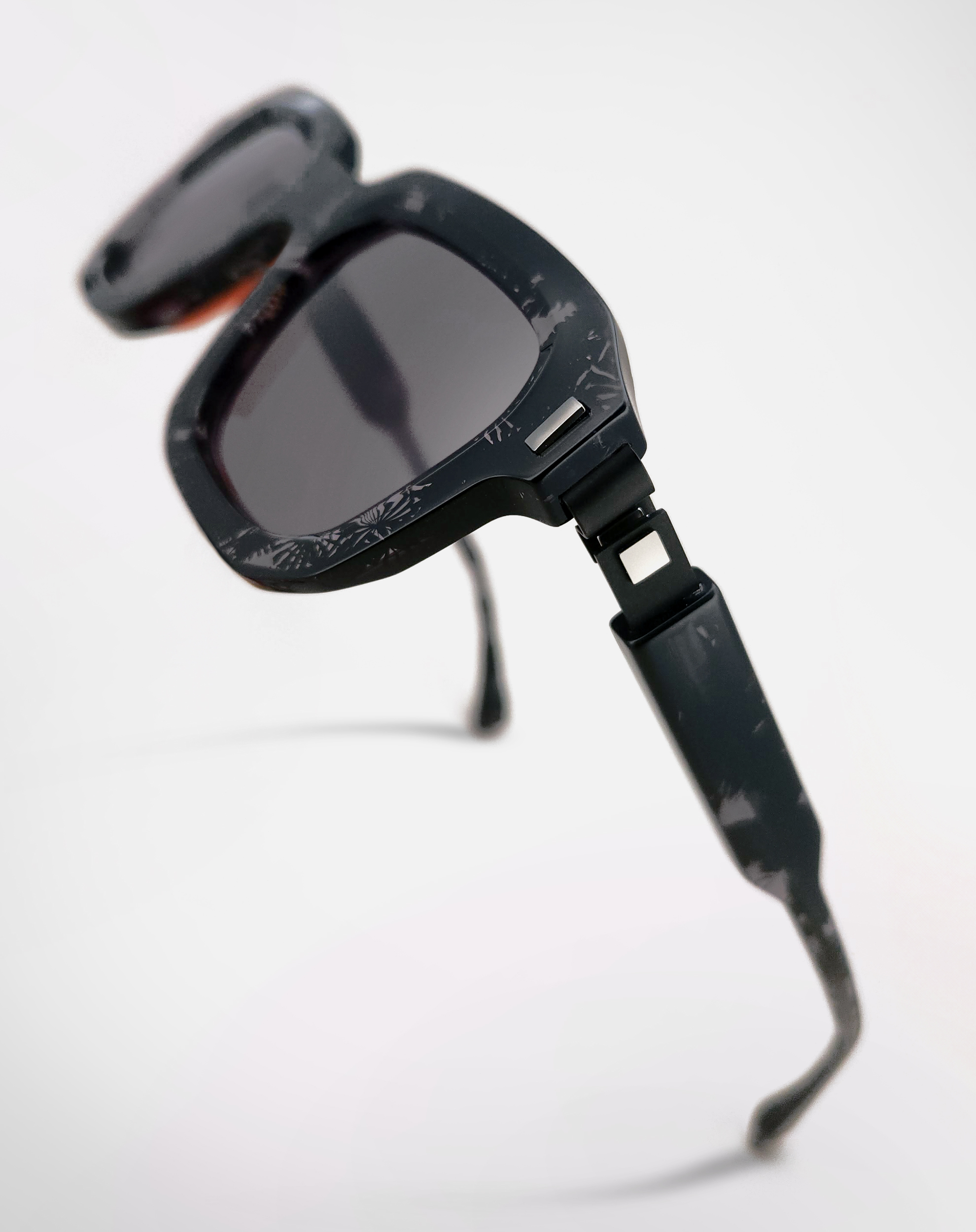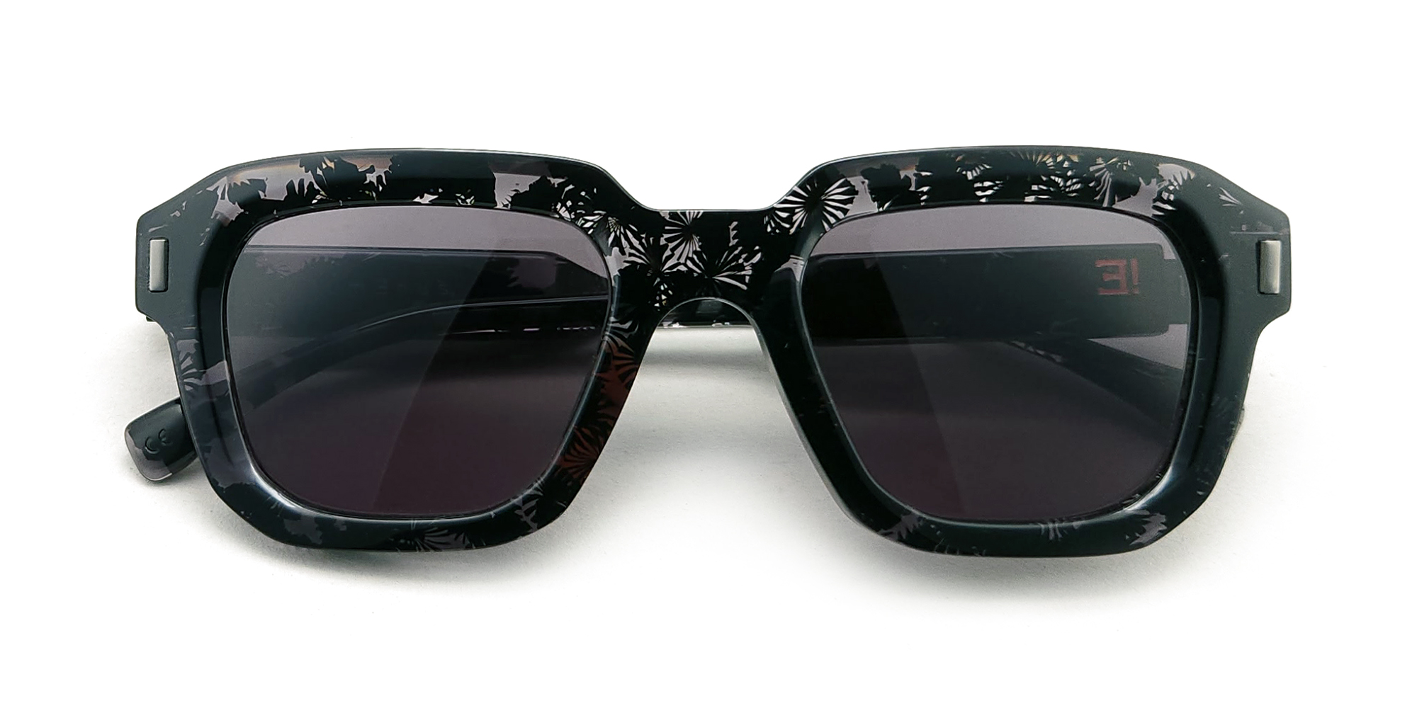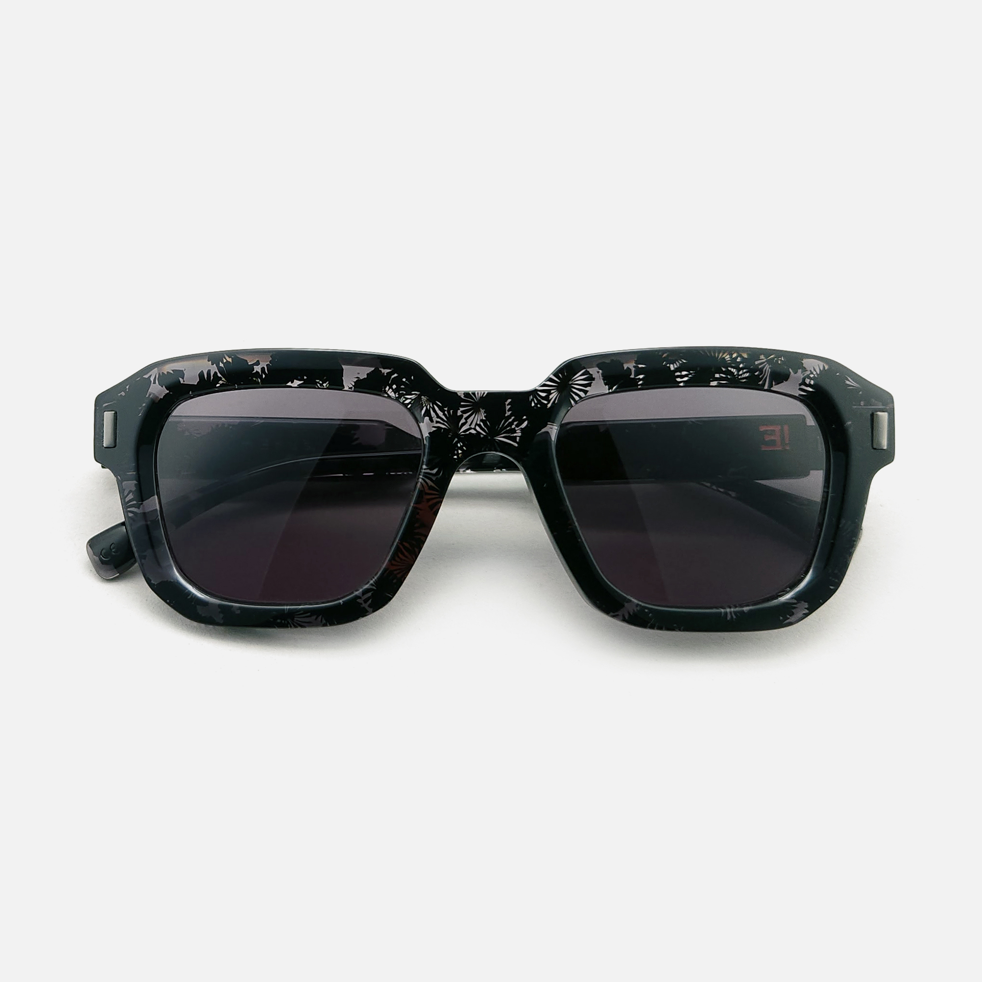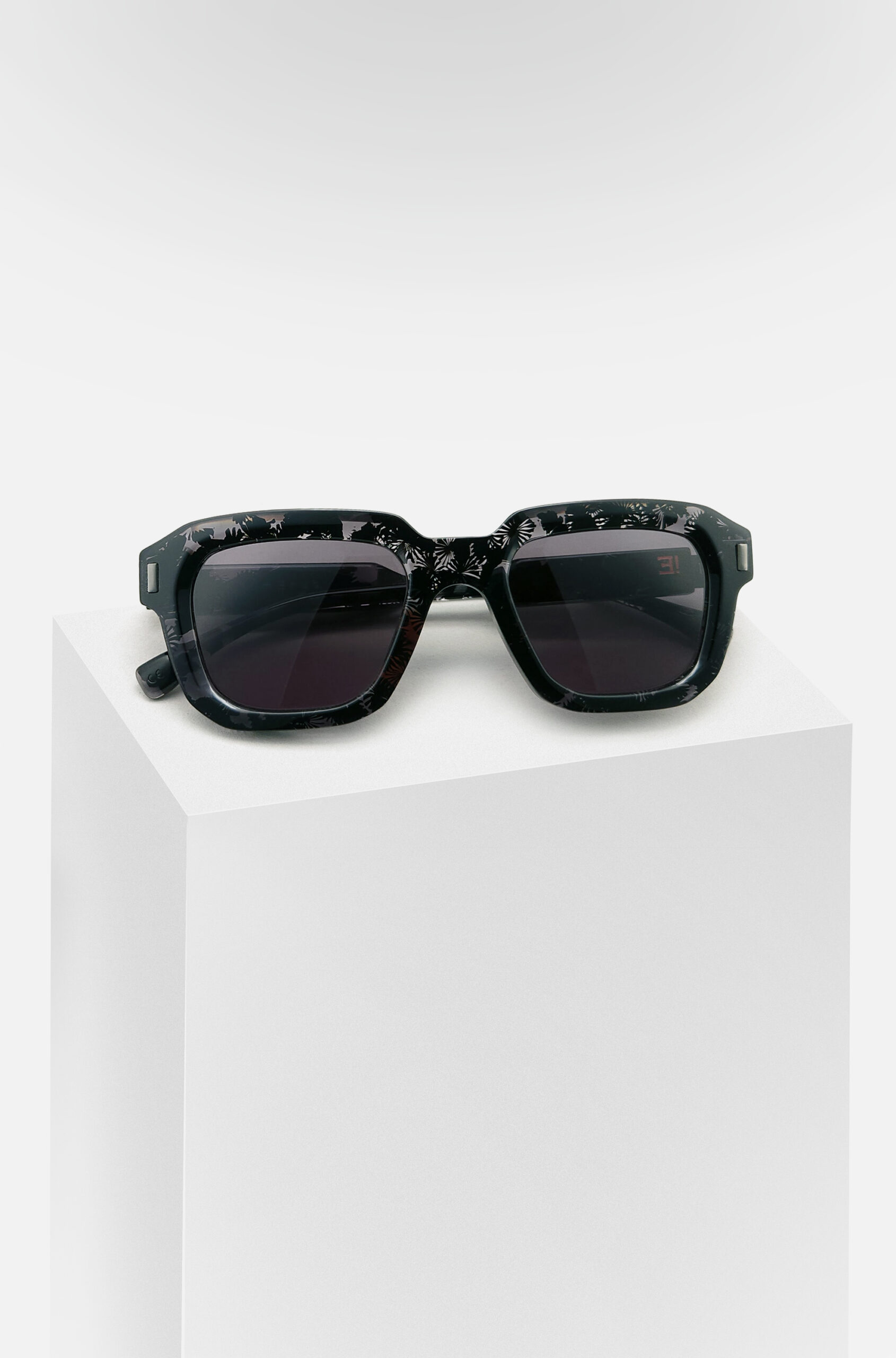 Une monture solaire de forme rectangulaire, objet de design, réalisée en acétate revalorisé.