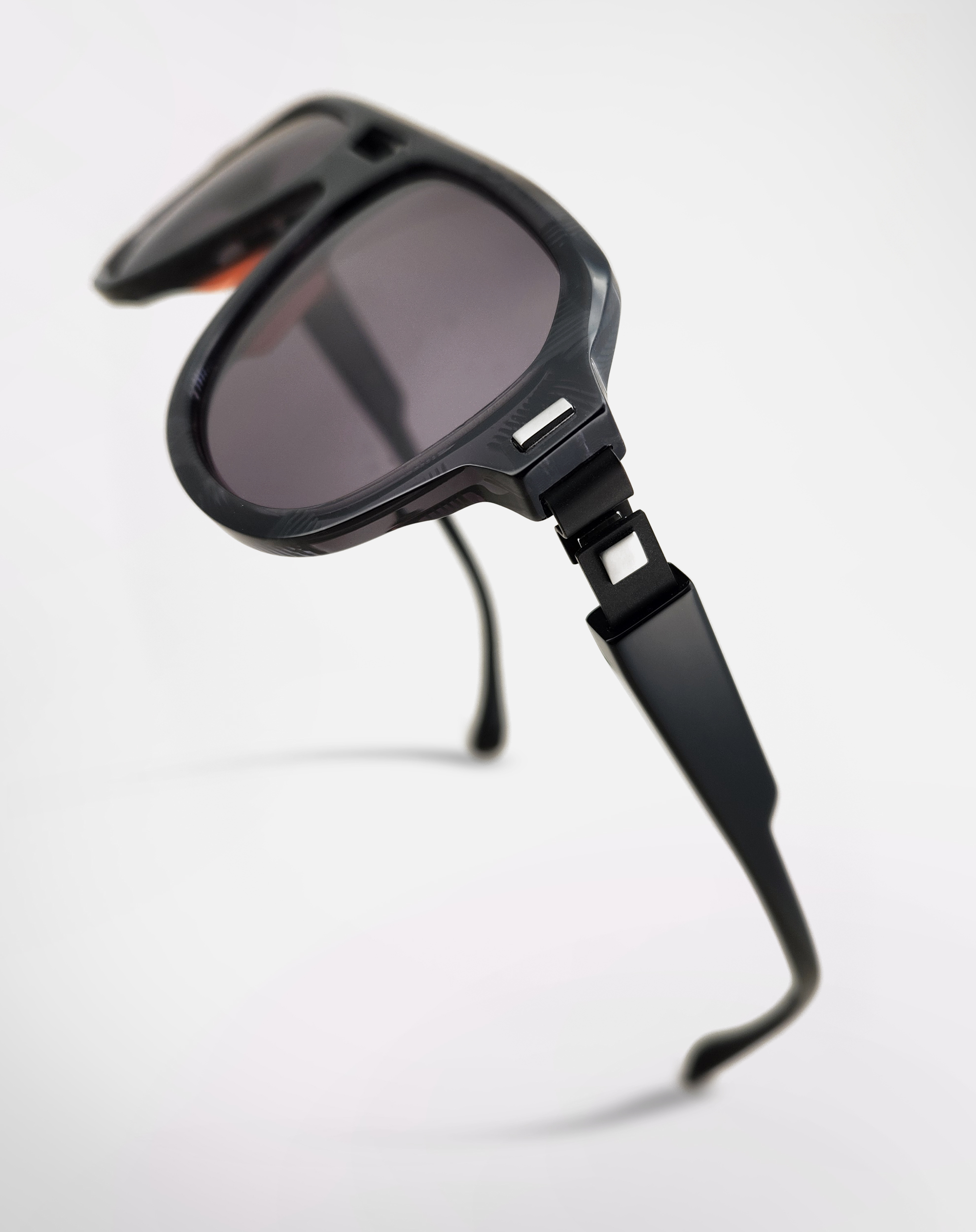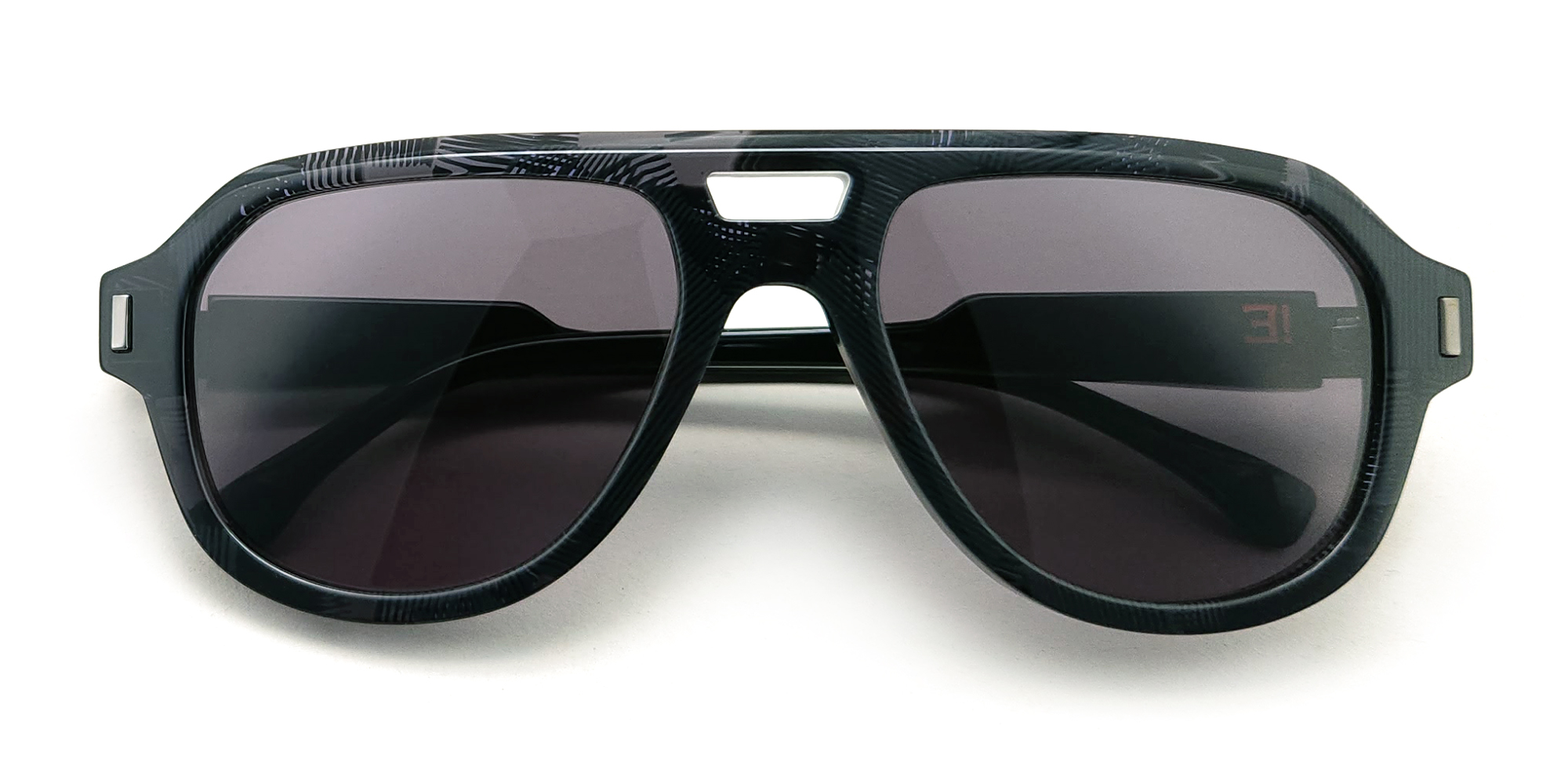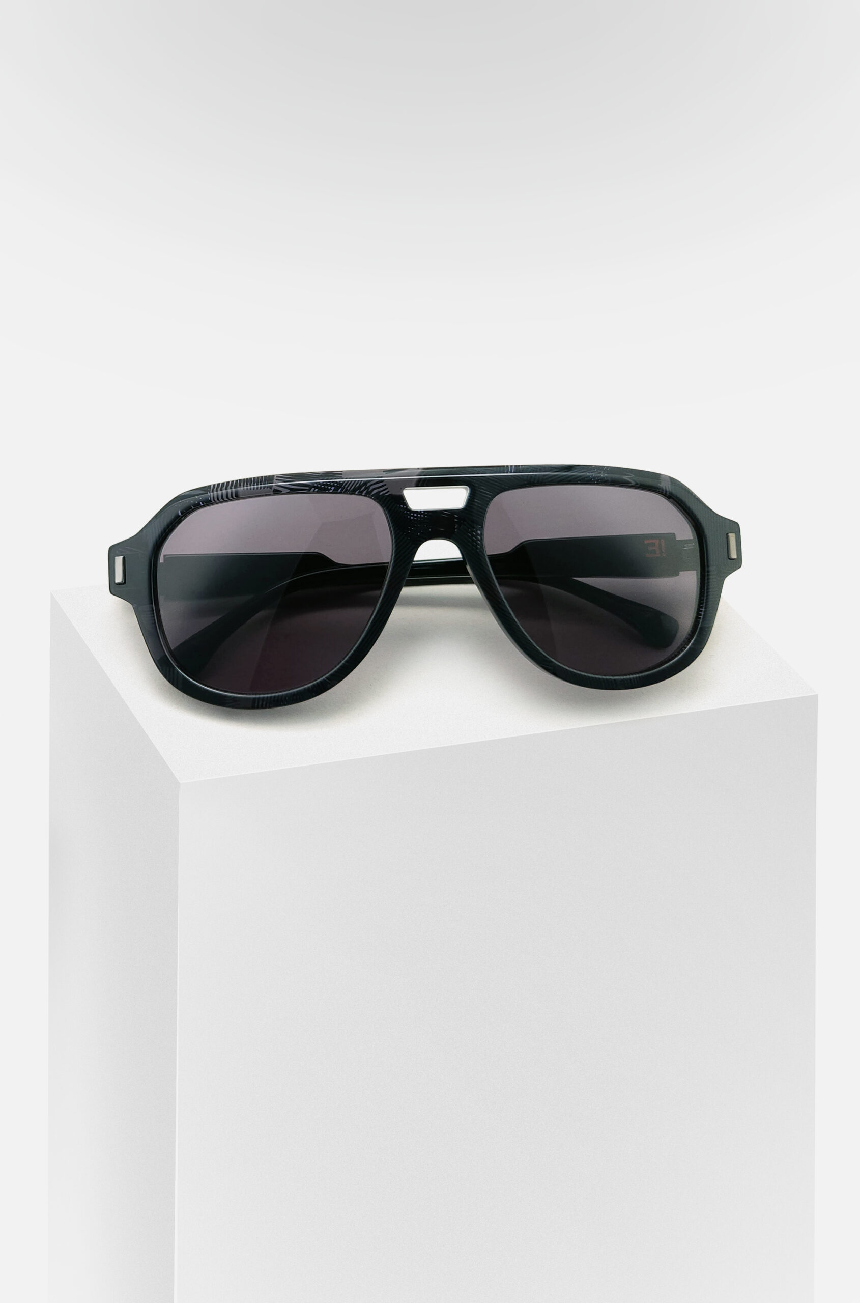 Une monture solaire de forme pilote, objet de design, réalisée en acétate revalorisé.