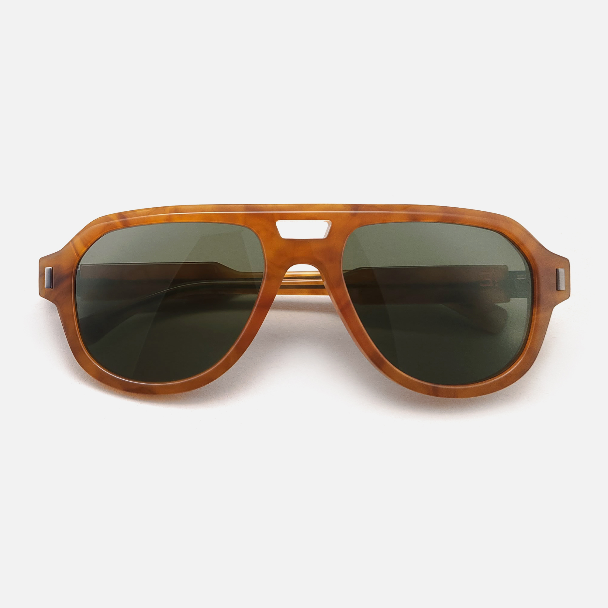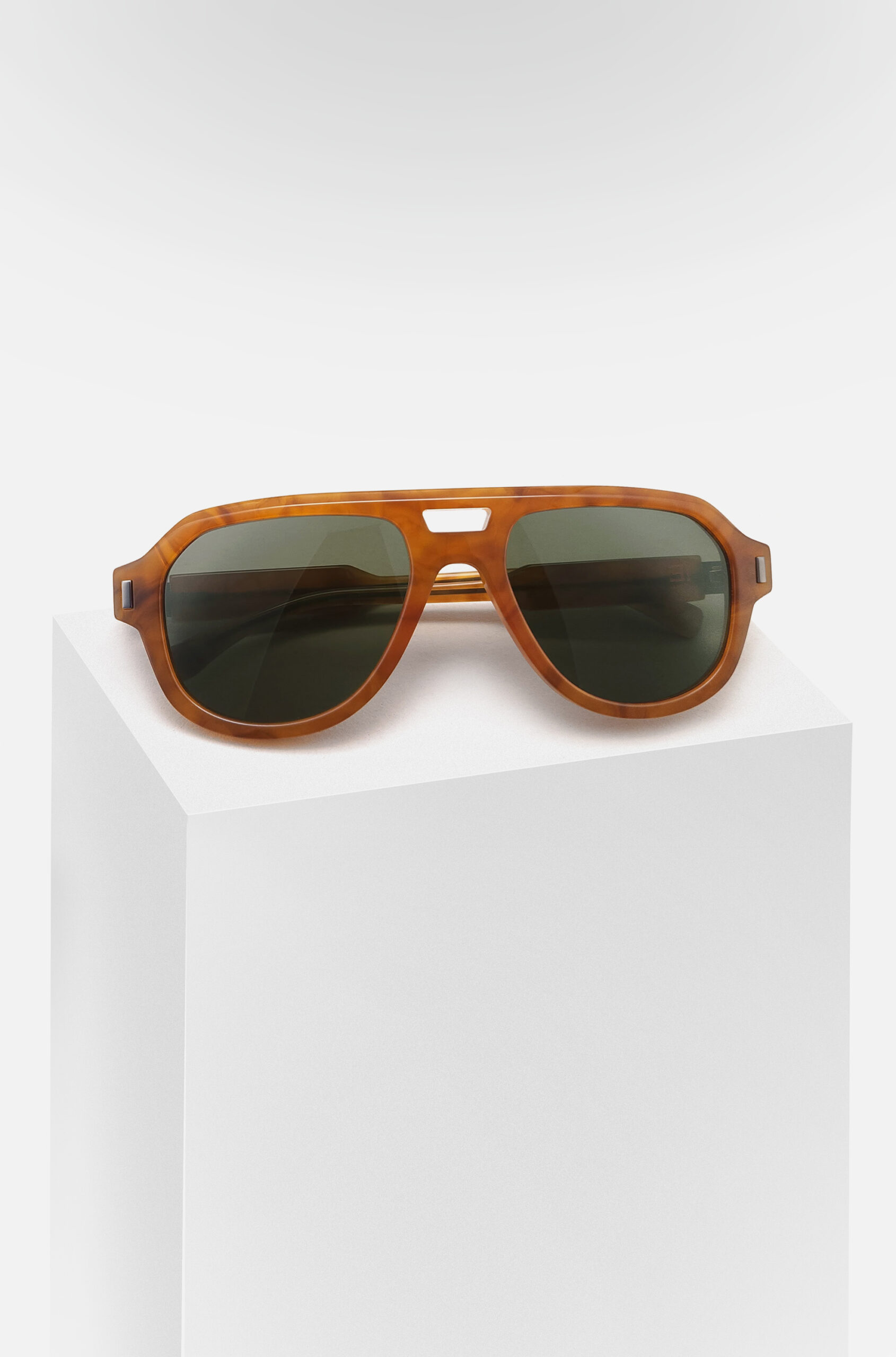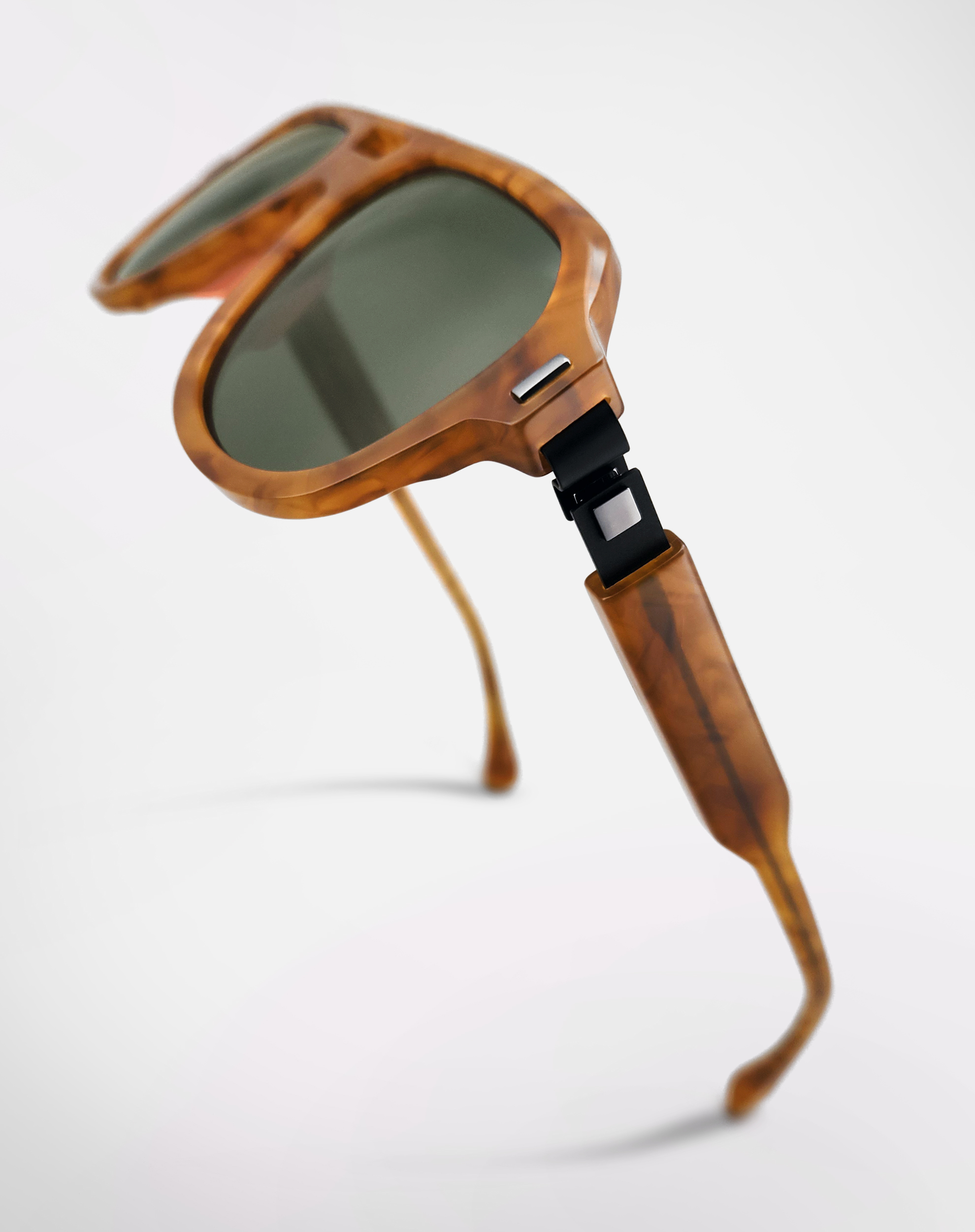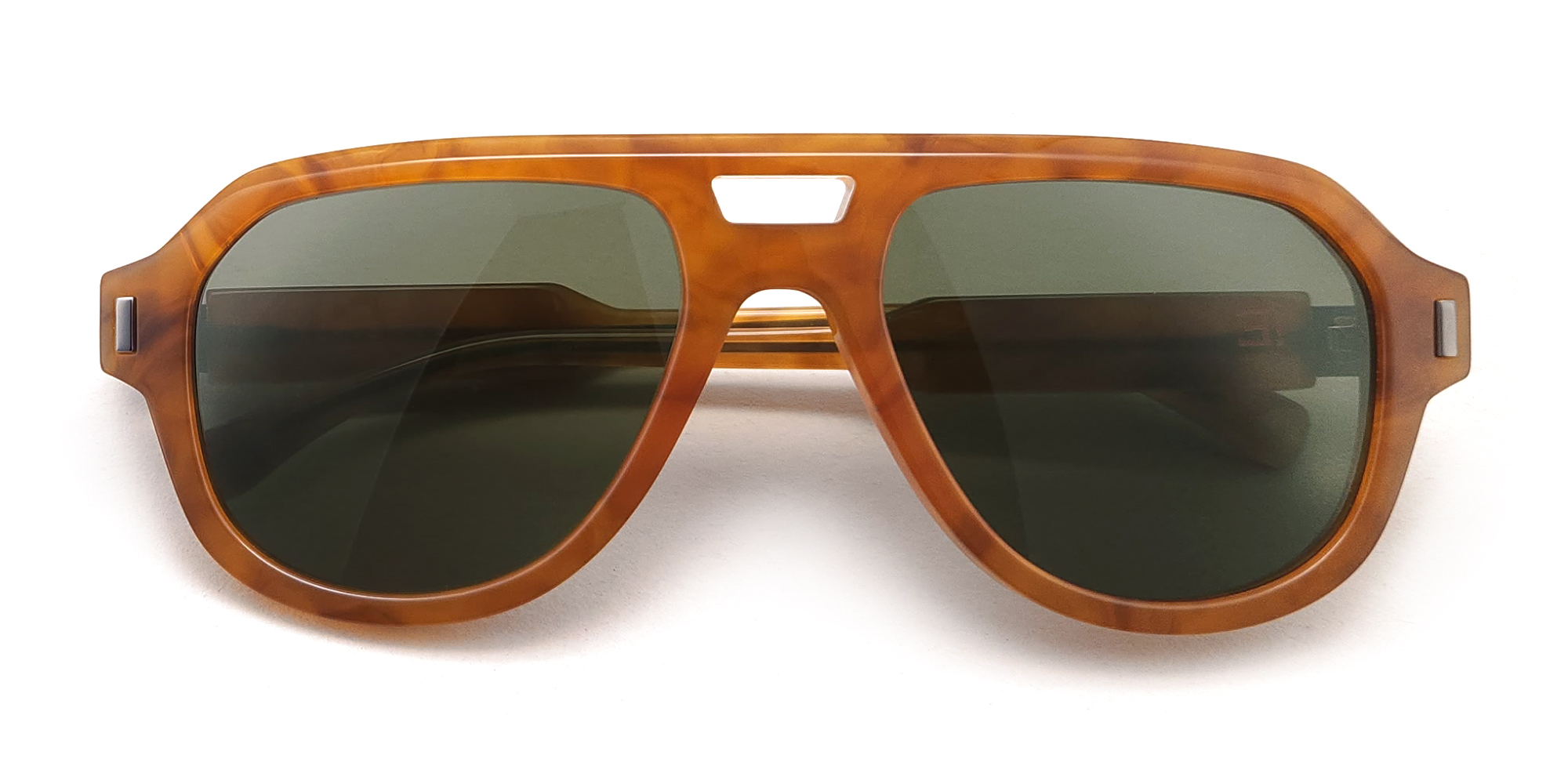 Une monture solaire de forme pilote, objet de design, réalisée en acétate revalorisé.
