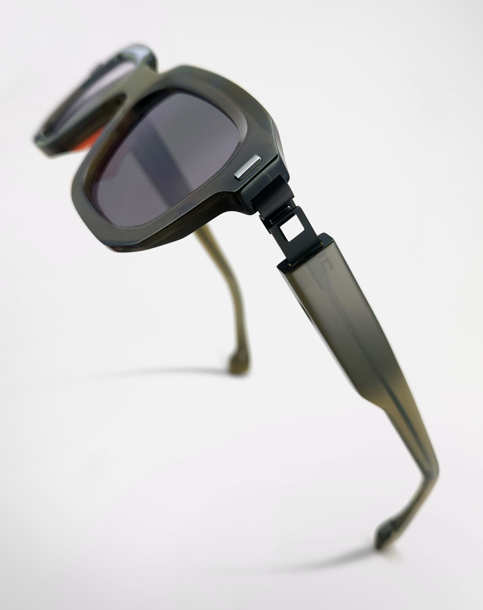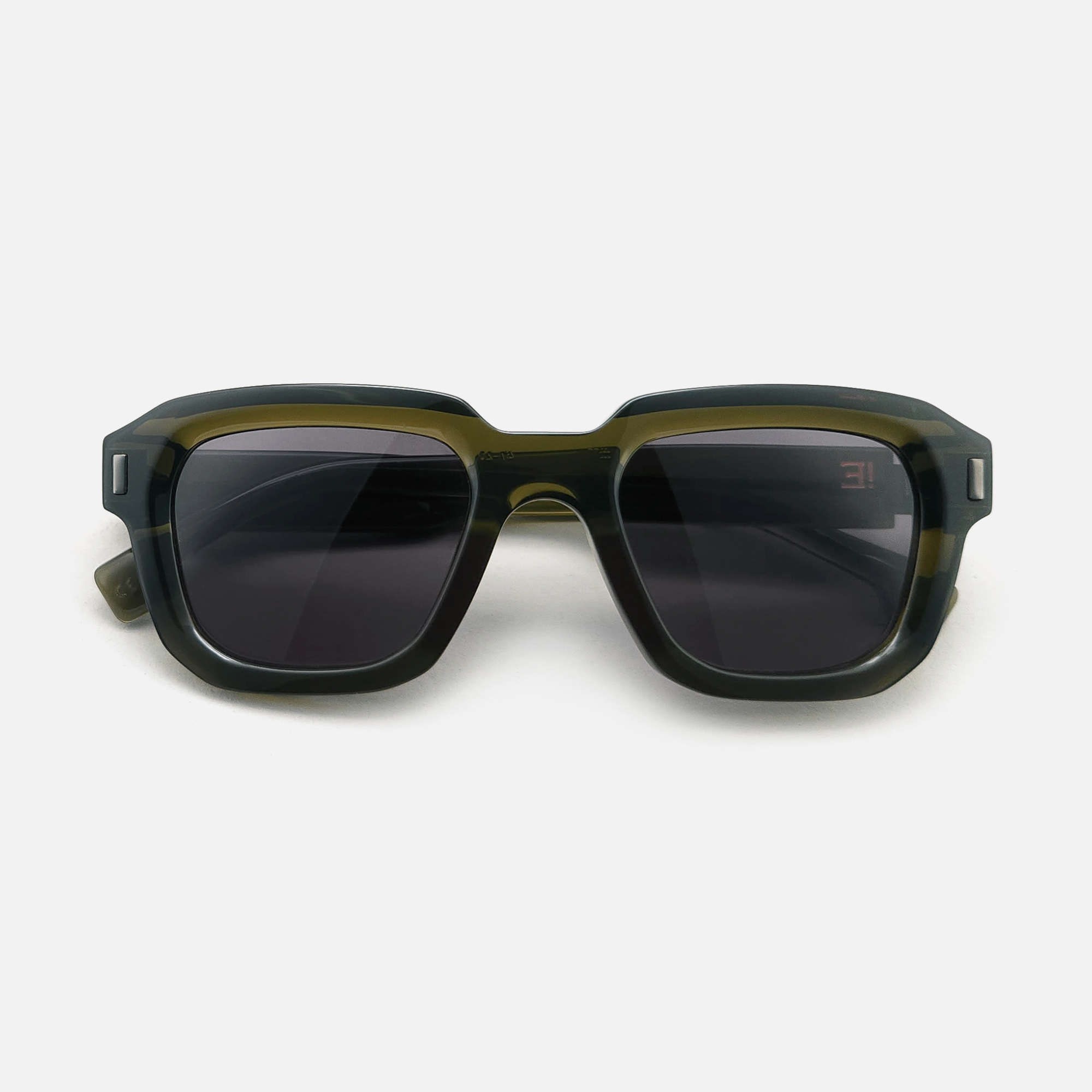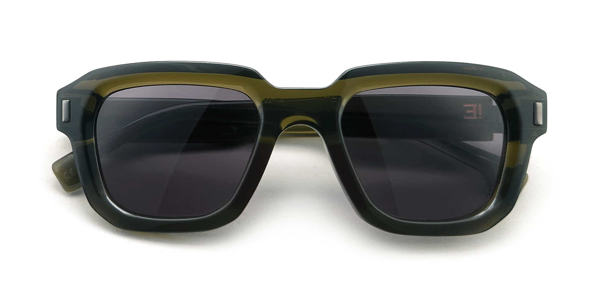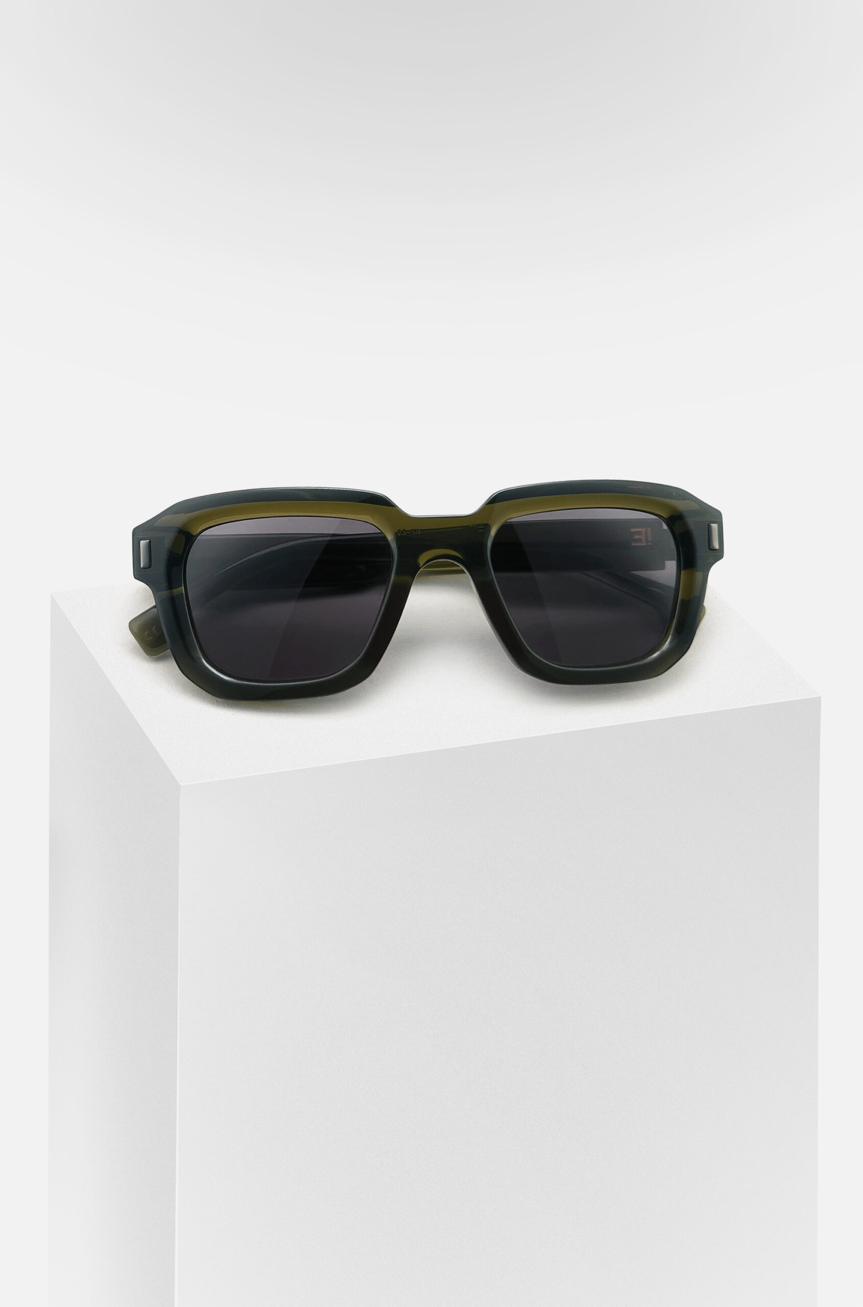 Une monture solaire de forme rectangulaire, objet de design, réalisée en acétate revalorisé.