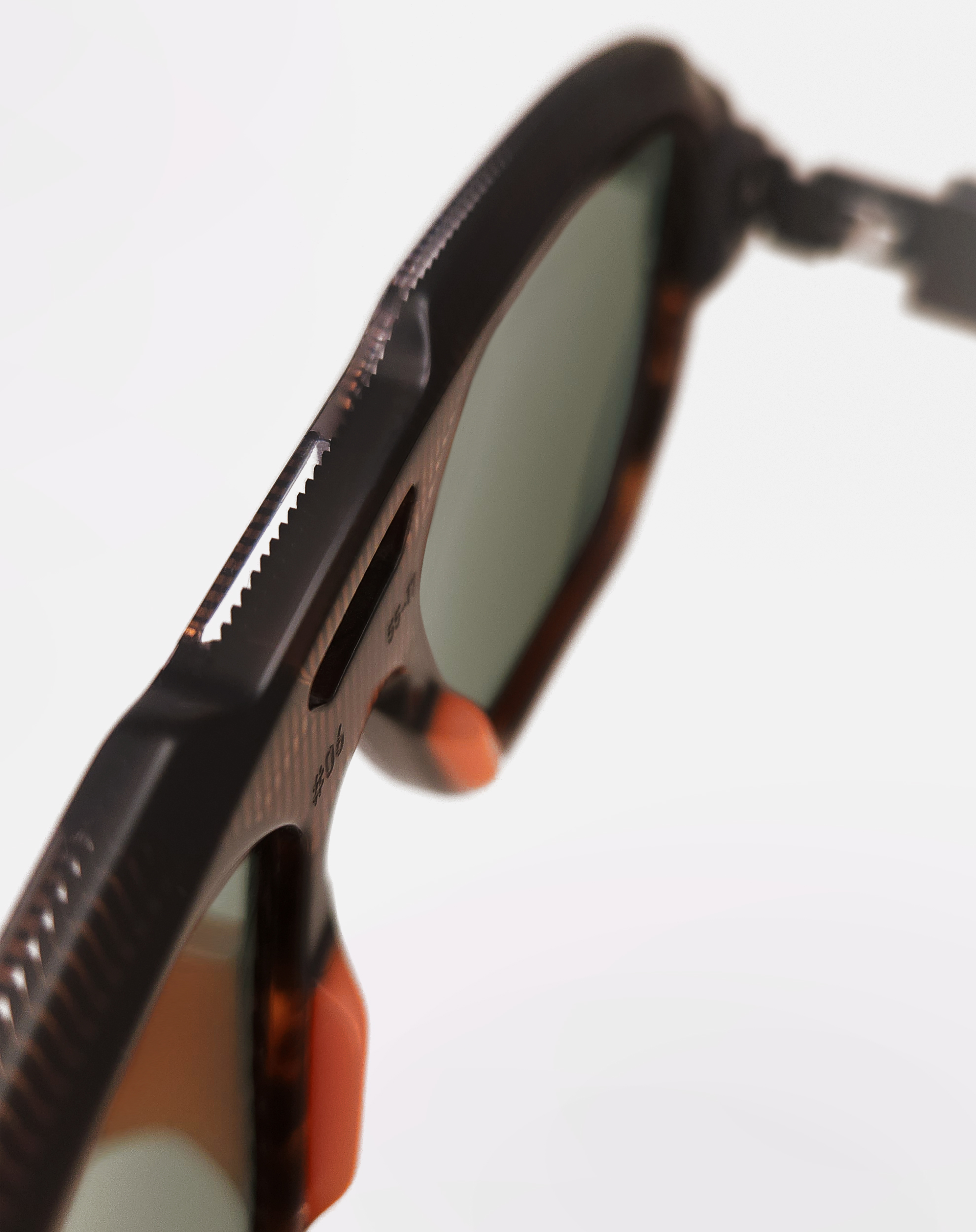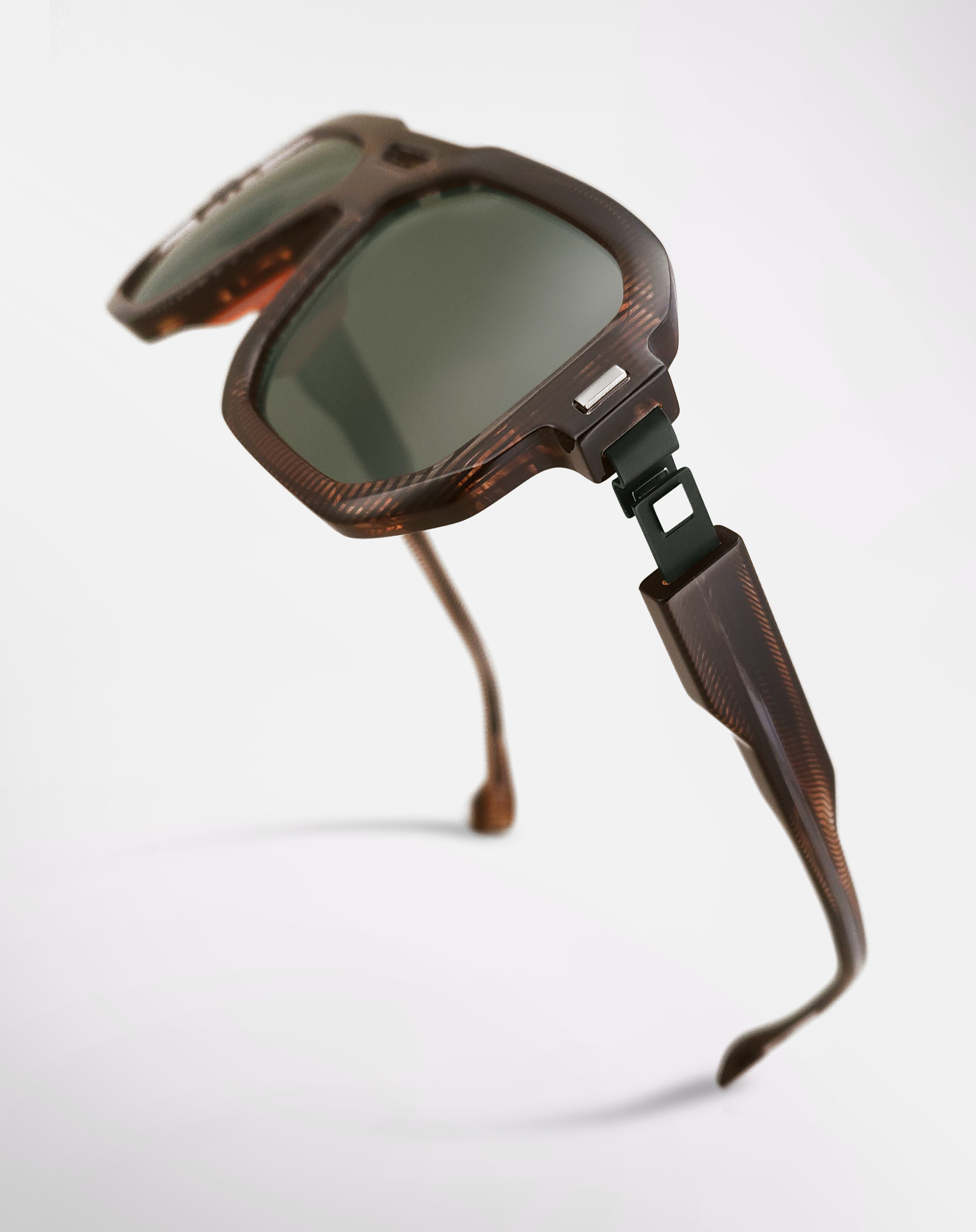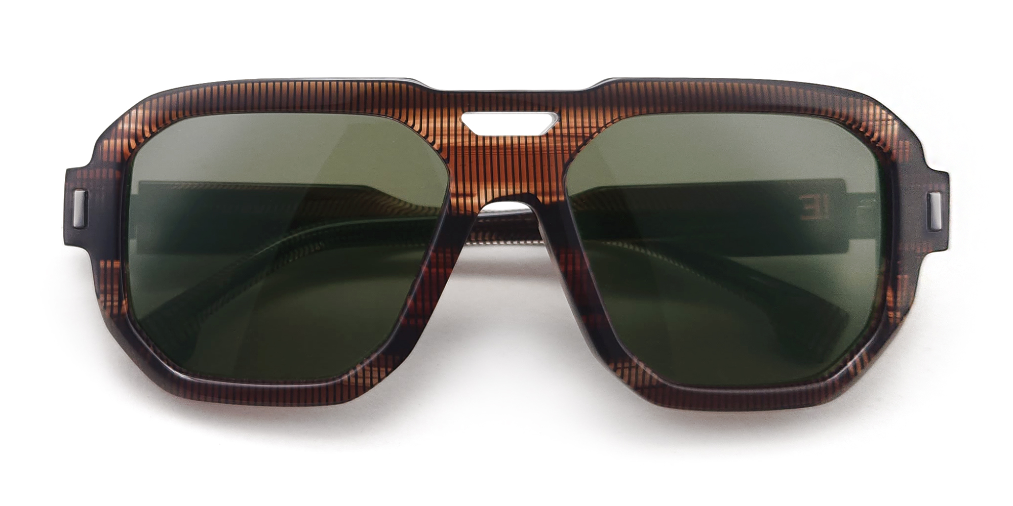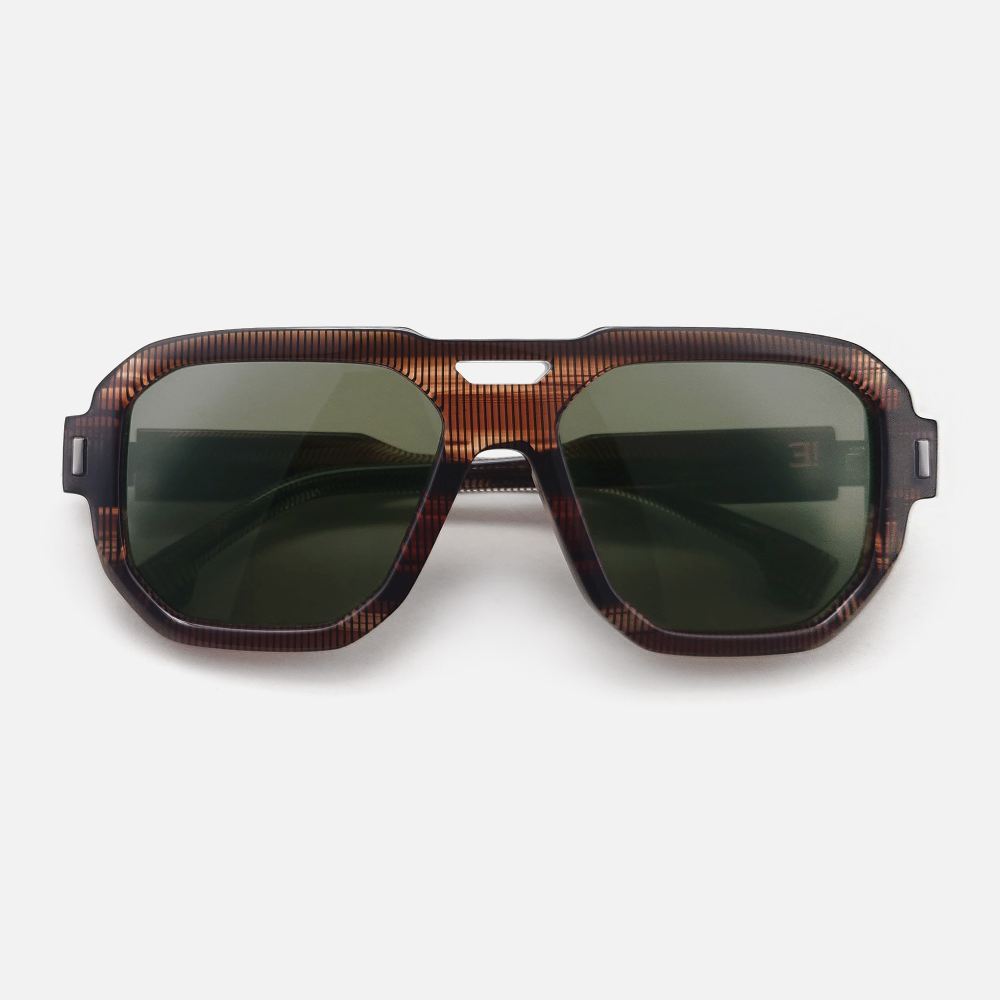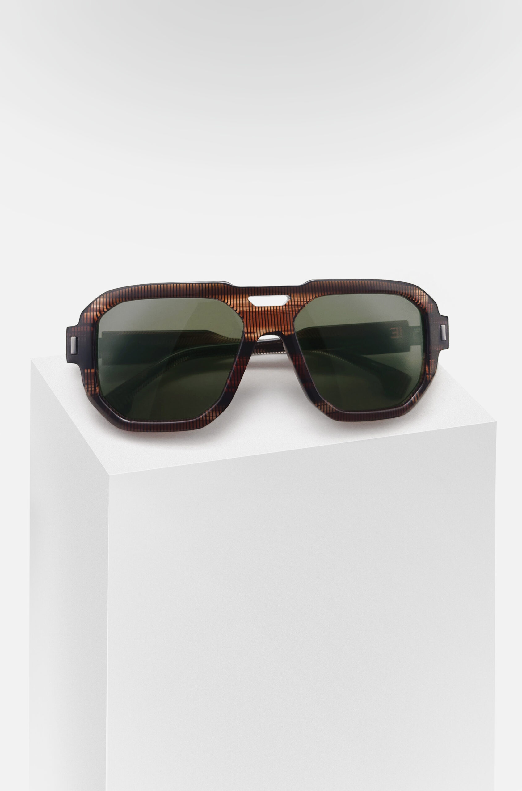 Une monture solaire de forme pilote, objet de design, réalisée en acétate revalorisé.