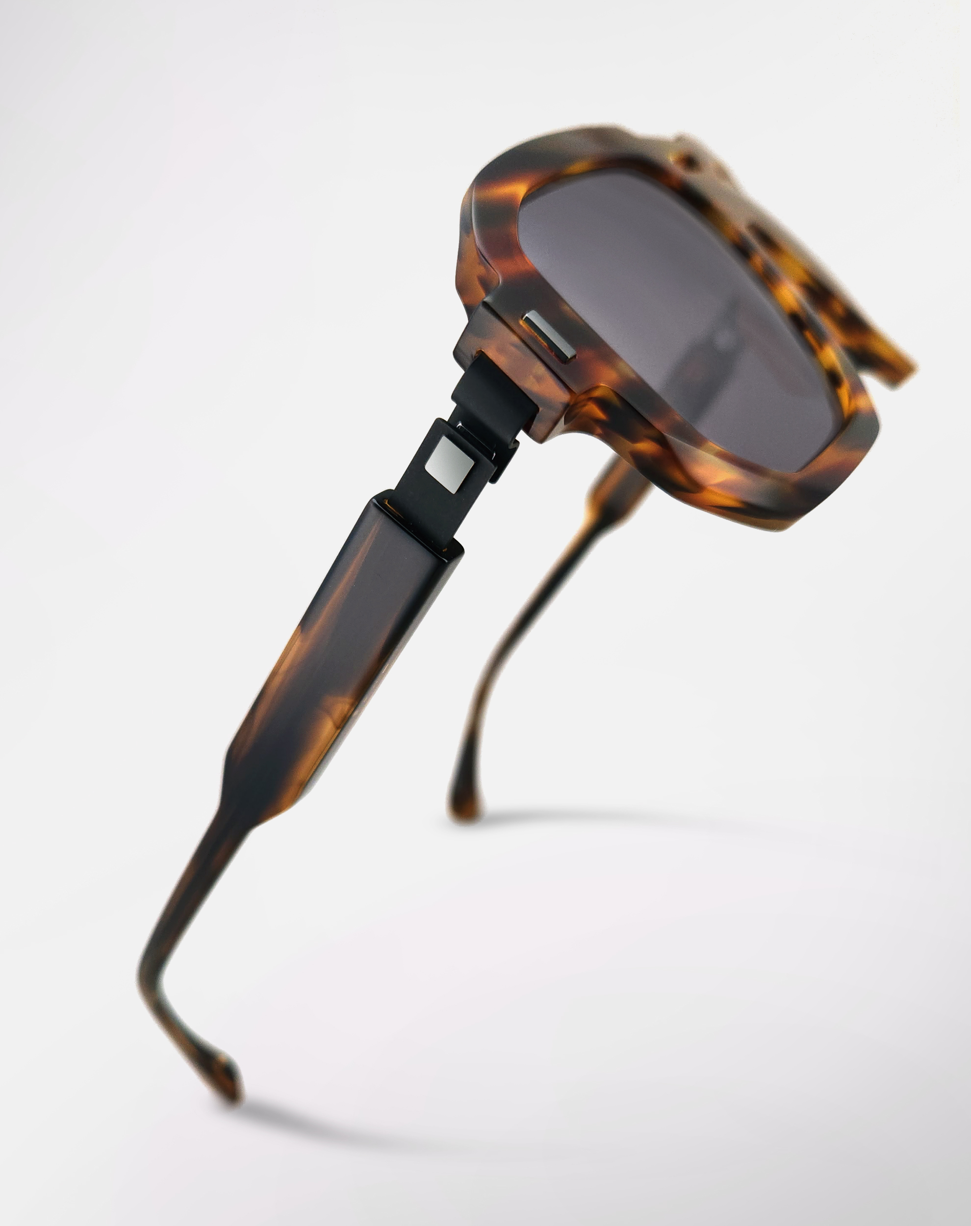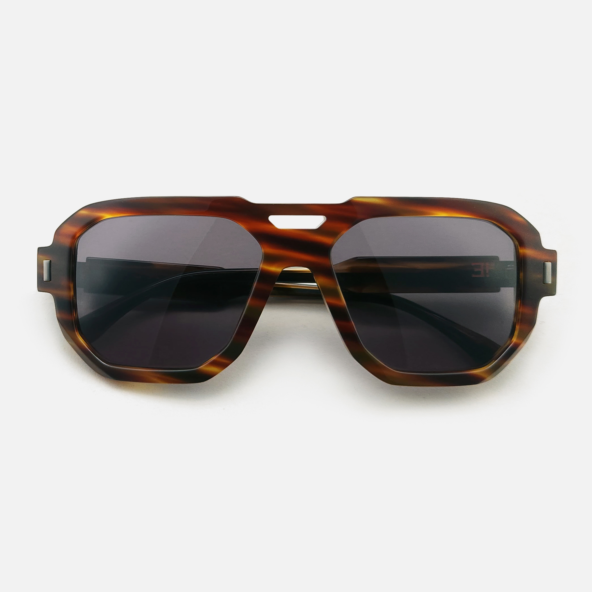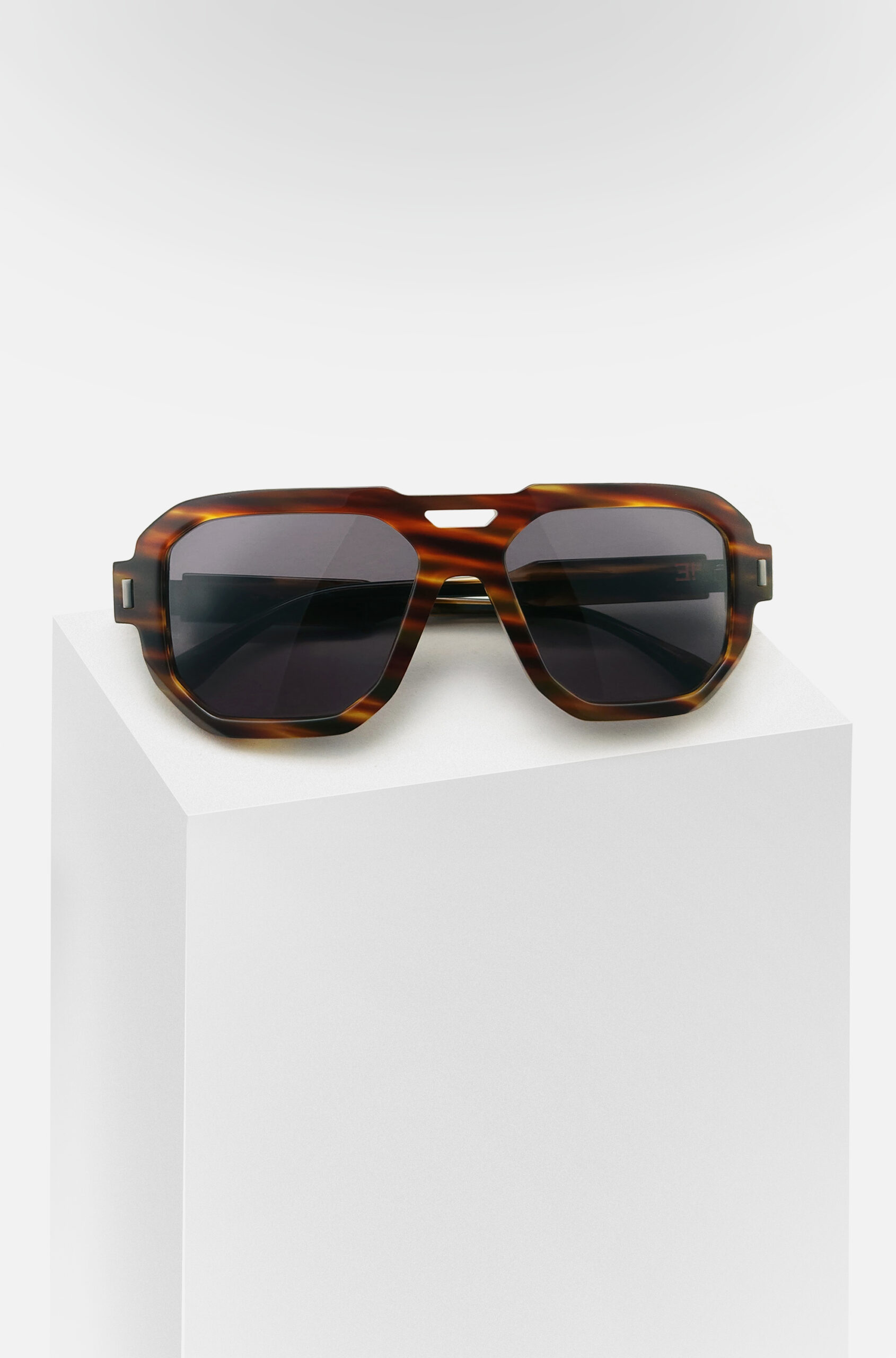 Une monture solaire de forme pilote, objet de design, réalisée en acétate revalorisé.